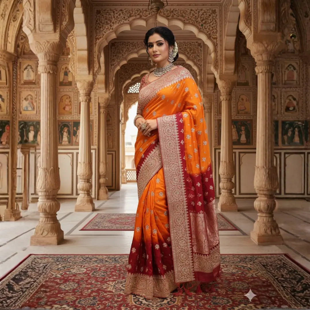 - Saree: Sarees that are inspired by the art and craft of Rajasthan. Made with bandhani, pila, and detailed hand work, adding grace to the elegance. Sarees that can be worn during weddings and festivals.