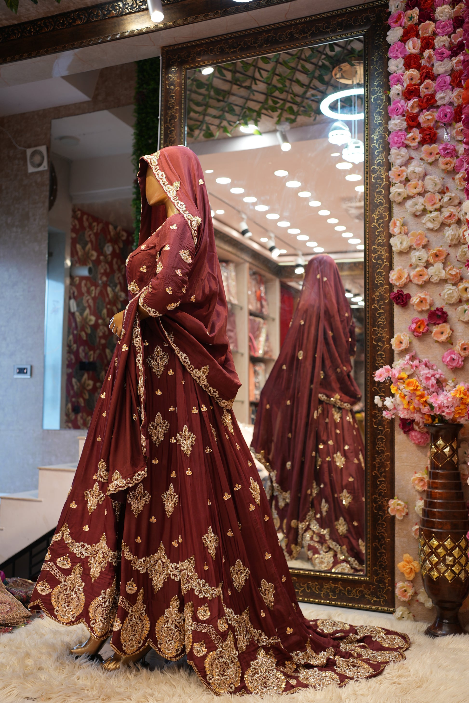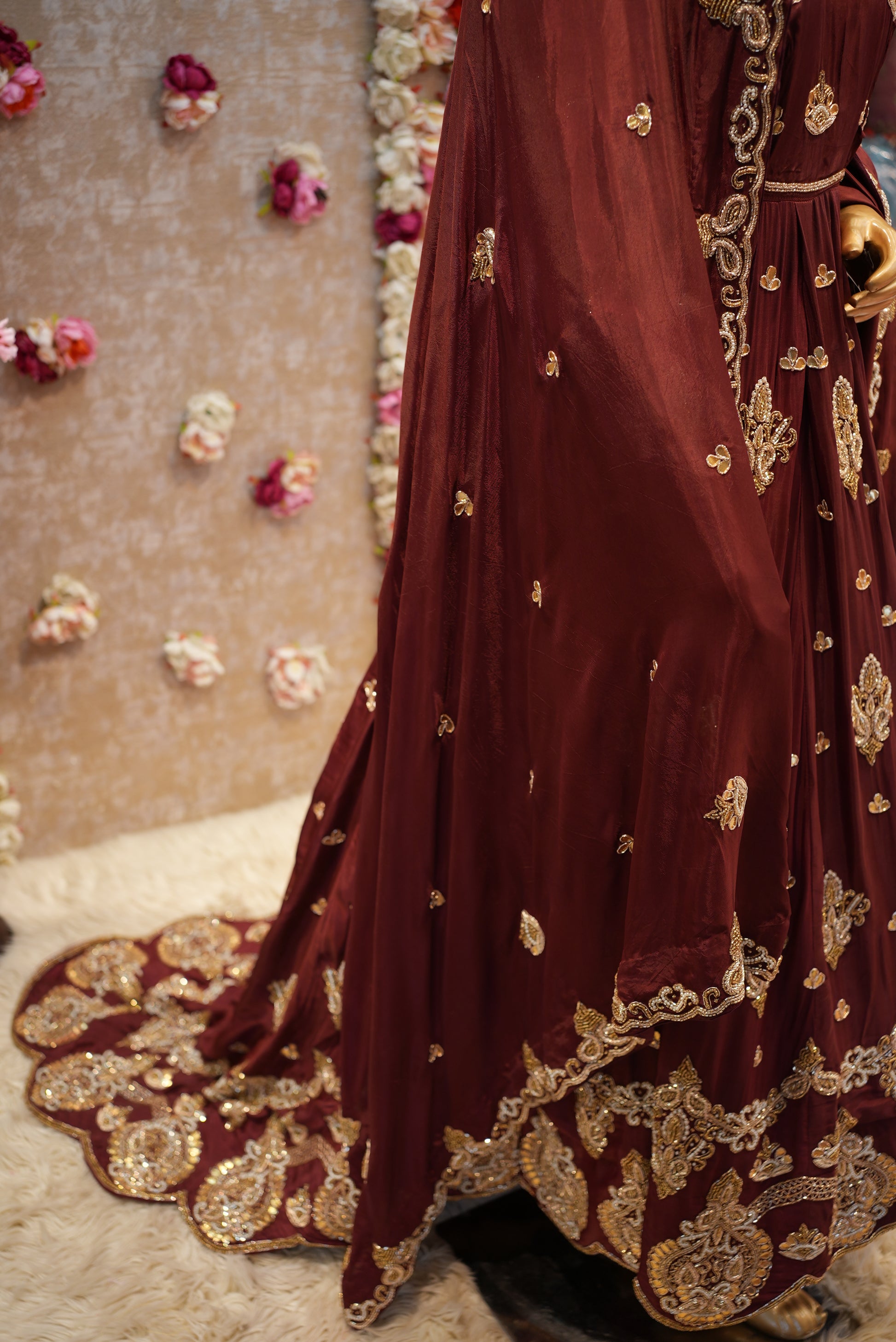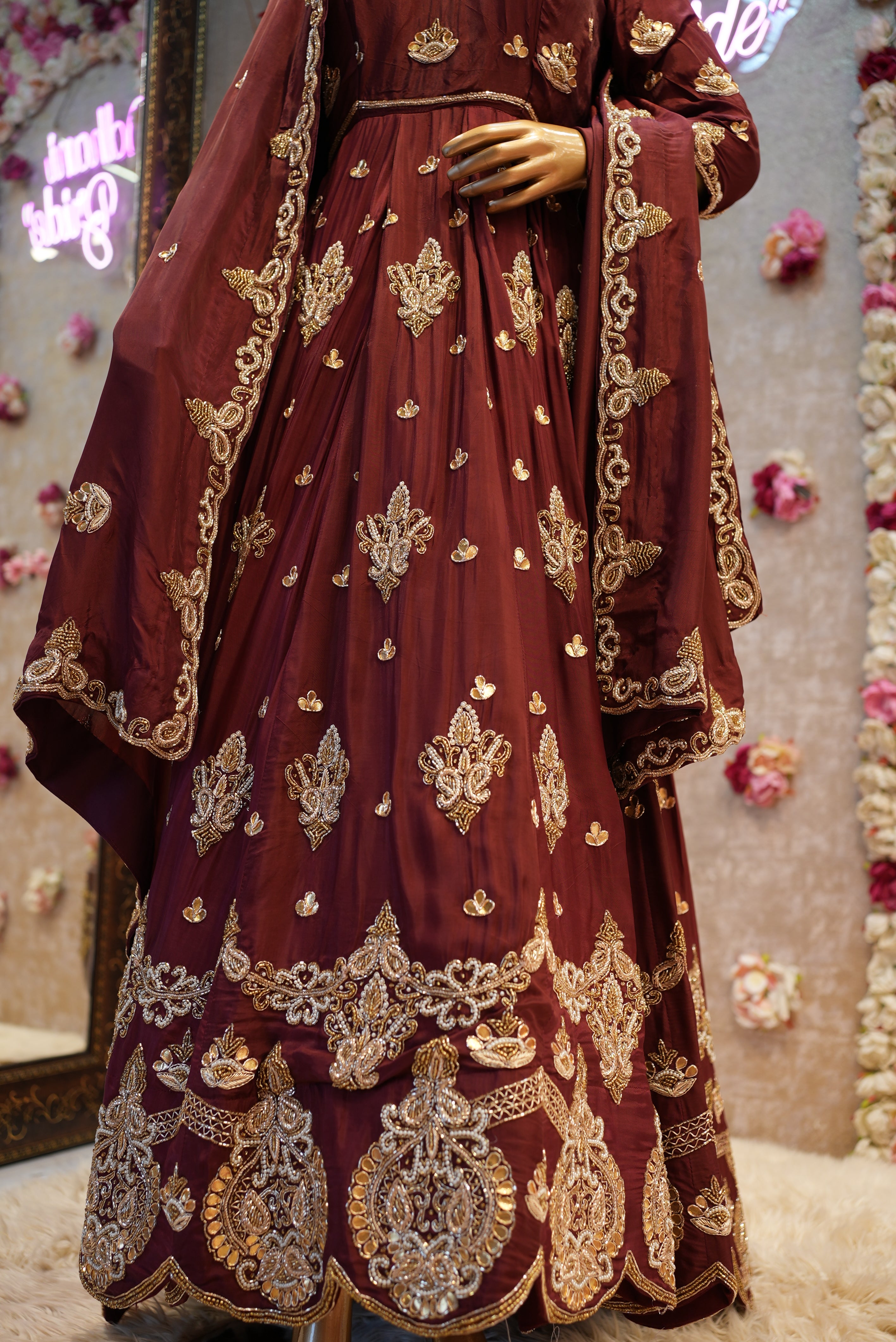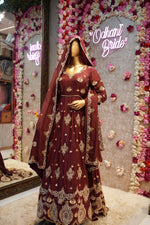 This exquisite bridal gown is a perfect blend of traditional craftsmanship and luxurious fabric. Made from the finest Upada silk, the gown features intricate zardosi handwork—a time-honored embroidery technique that adds depth and elegance. The gown is beautifully crafted in a flattering shape, accentuating the bridal silhouette with its flowing lines and detailed embellishments. The standout feature is the heavy handwork dupatta, which drapes gracefully, complementing the gown’s opulence. The pure handwork on both the gown and dupatta creates a stunning, timeless look, making it an ideal choice for brides who want to feel both regal and sophisticated on their special day.