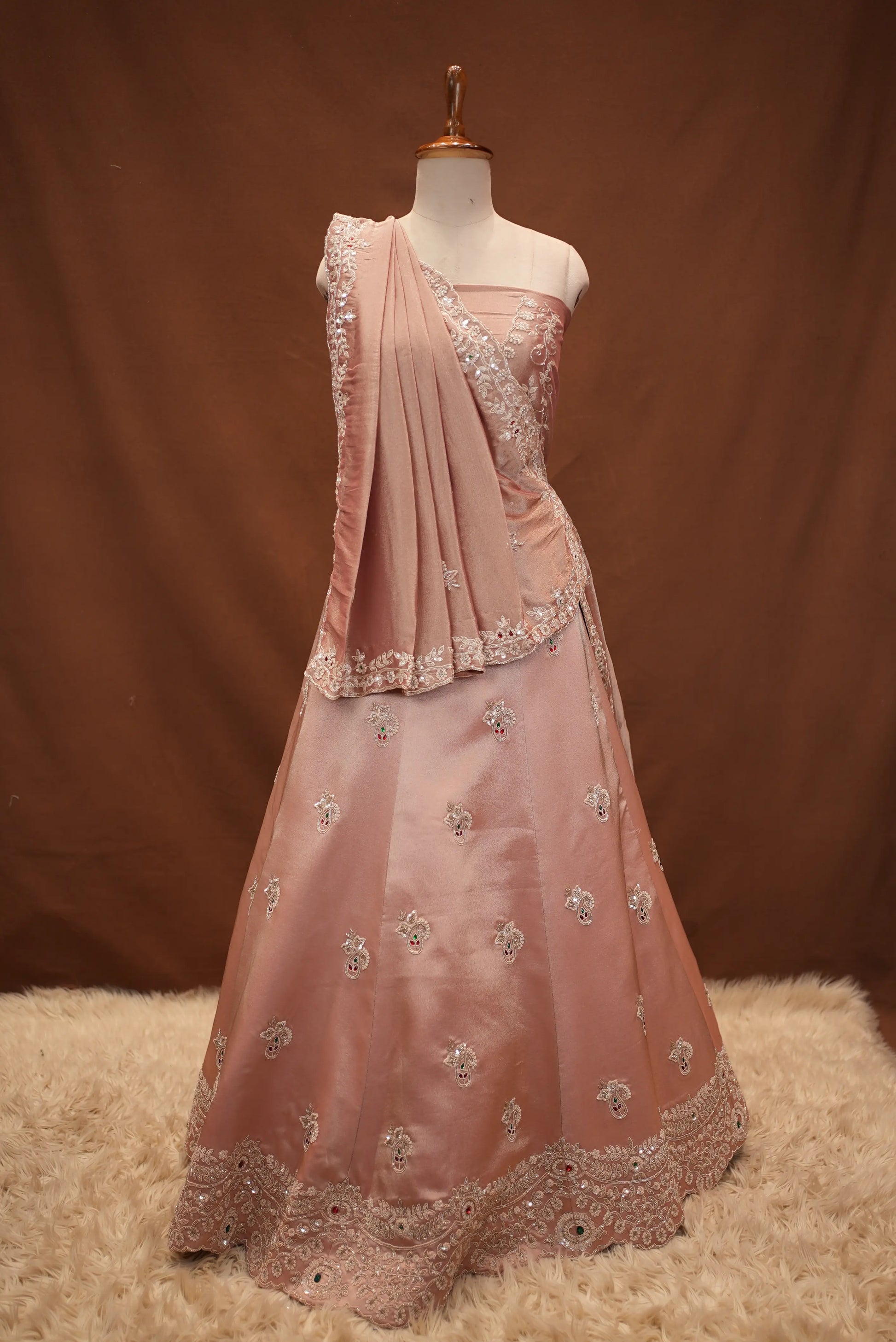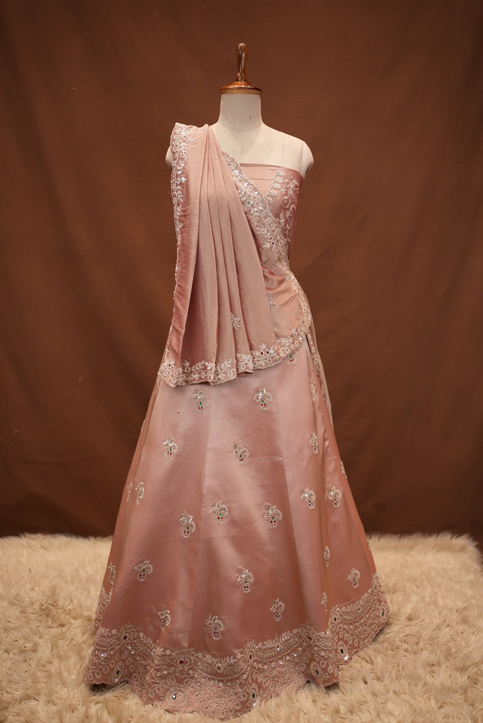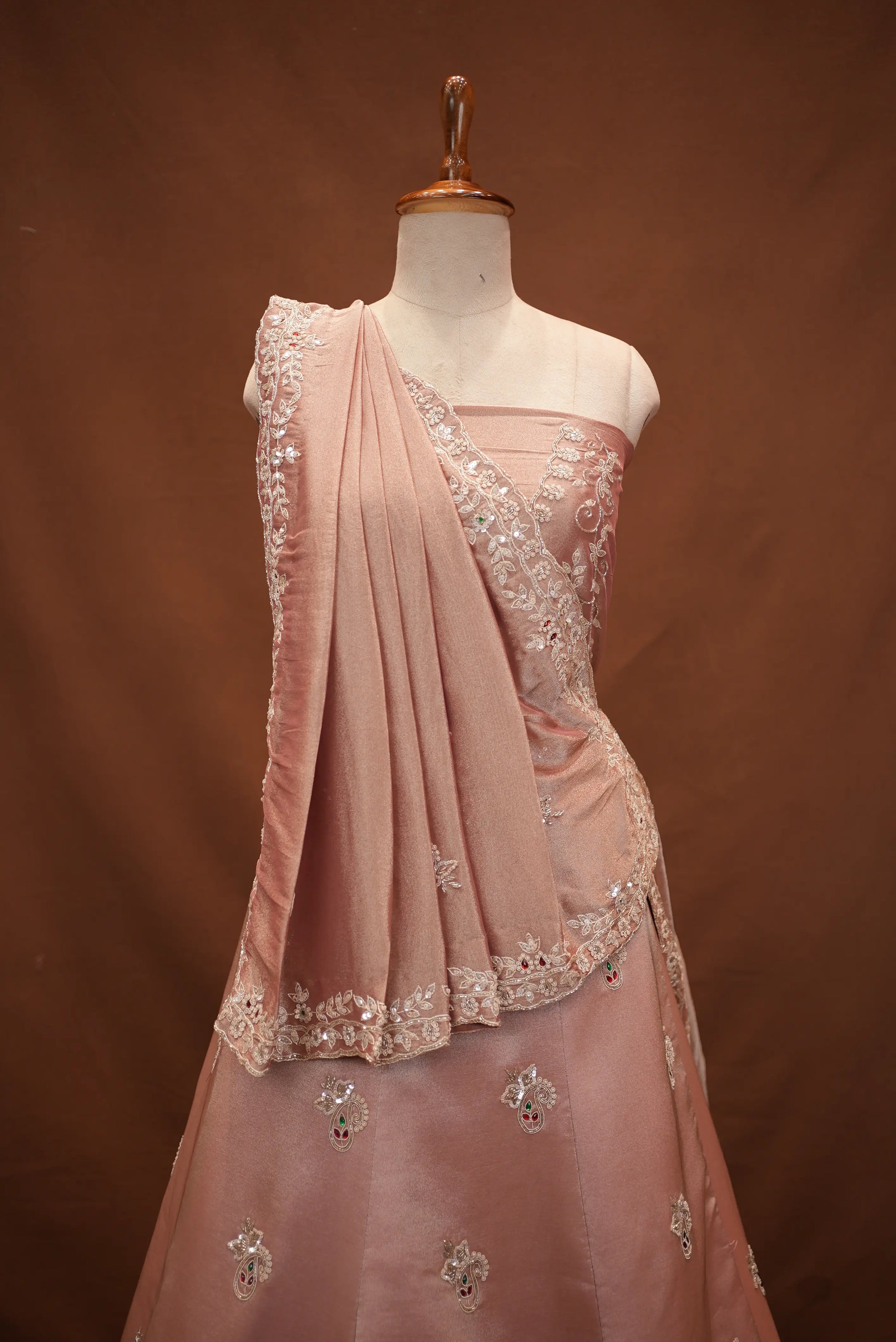 Feel the touch of royalty with this pure Kolkata work handwork lehenga, specially crafted to show rich traditional craftsmanship. It consists of a very heavily embroidered Zardozi work blouse, which adds just that extra touch of luxury and detail for the overall ensemble. A heavy cutwork-tissue fabric dupatta further embellishes the look and adds to the royalty of the outfit. Ideal for weddings, receptions, and grand celebrations, this set of lehengas personifies timelessness with its elegance and royal charm.