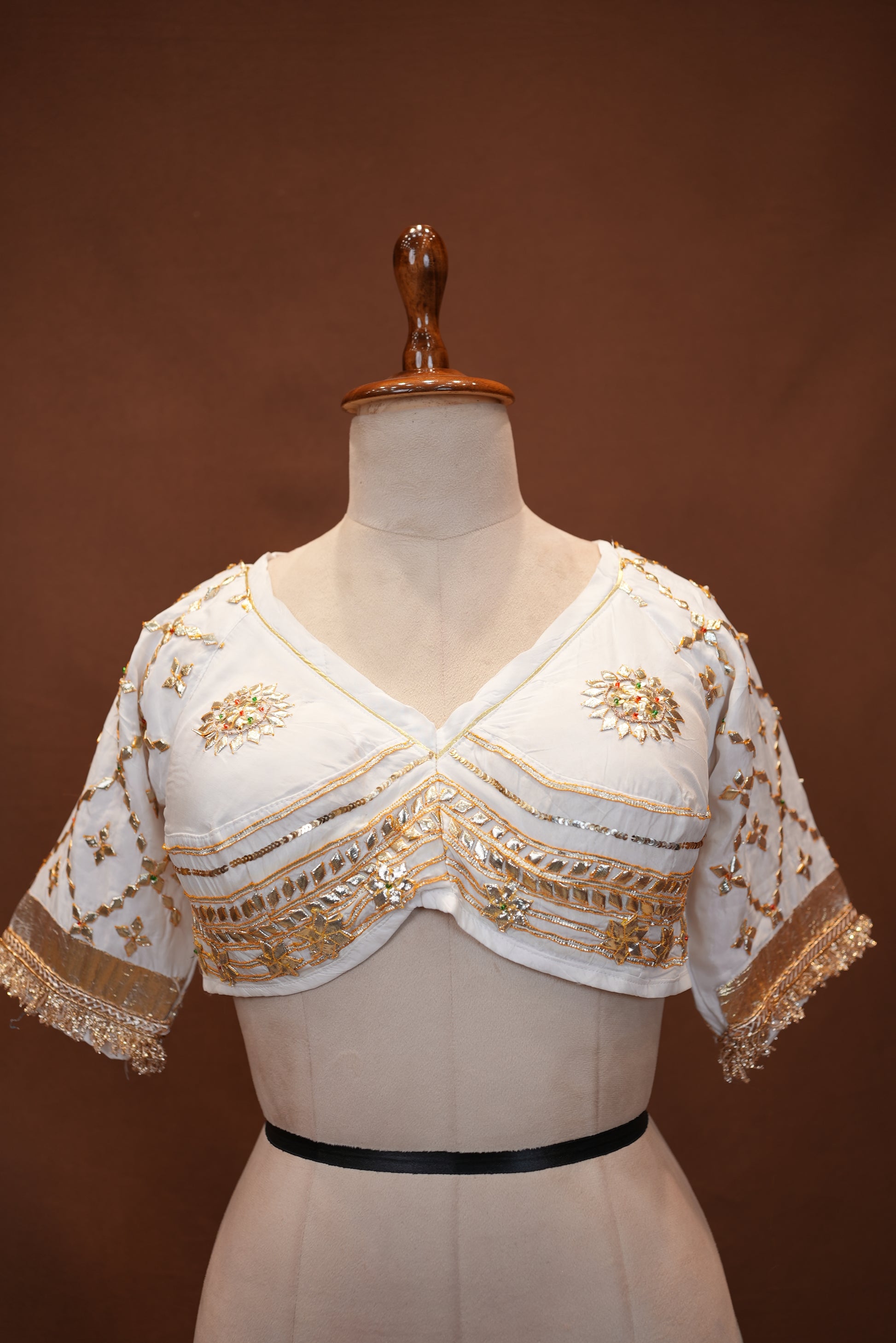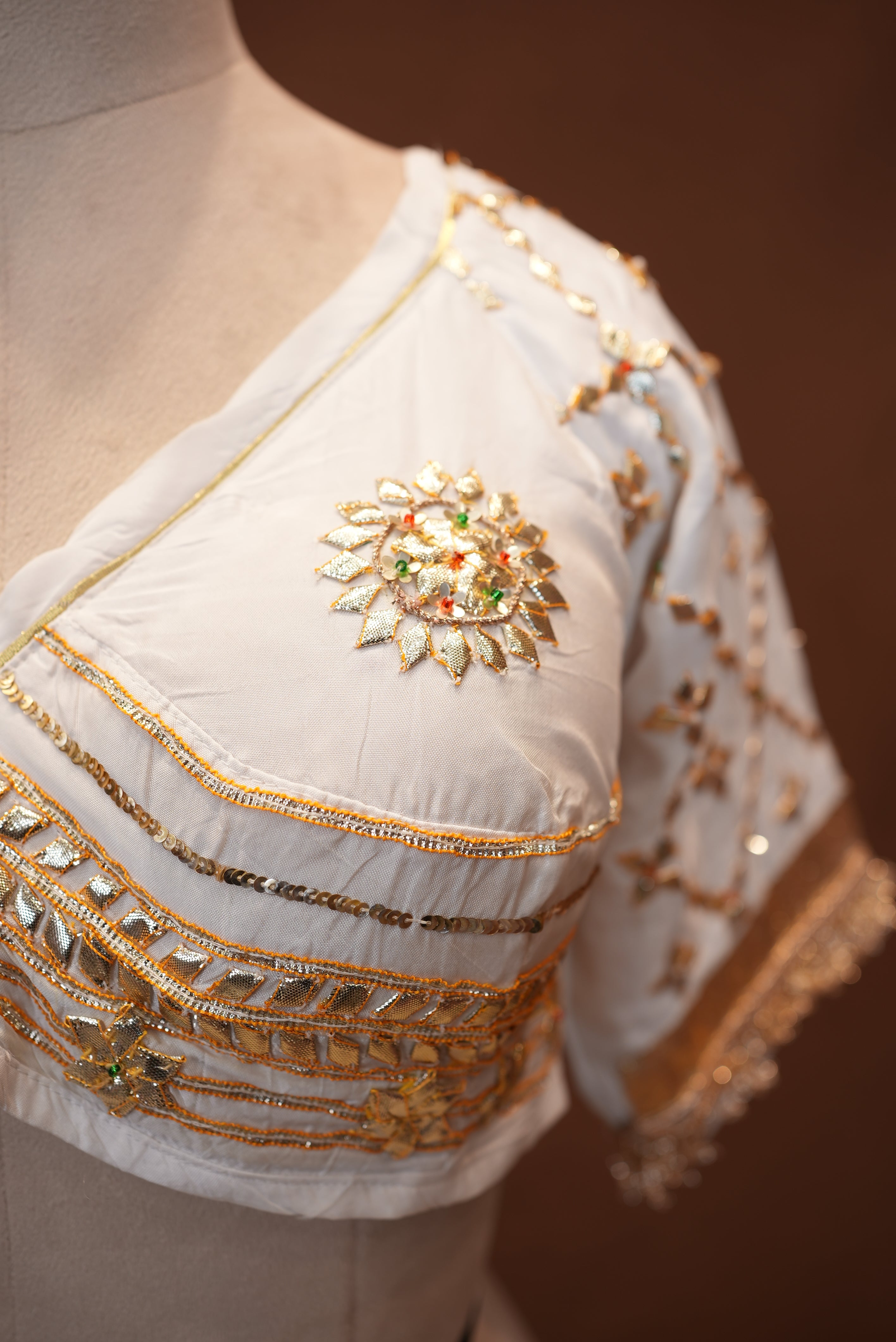 Step into tradition with this beautifully crafted Rajasthani Aangi blouse, featuring authentic Gota Patti handwork. Inspired by royal Rajasthani attire, this blouse brings together vibrant design and intricate detailing, making it perfect for pairing with lehengas, sarees, or traditional skirts. A timeless piece that reflects the rich heritage and artistry of Rajasthan.