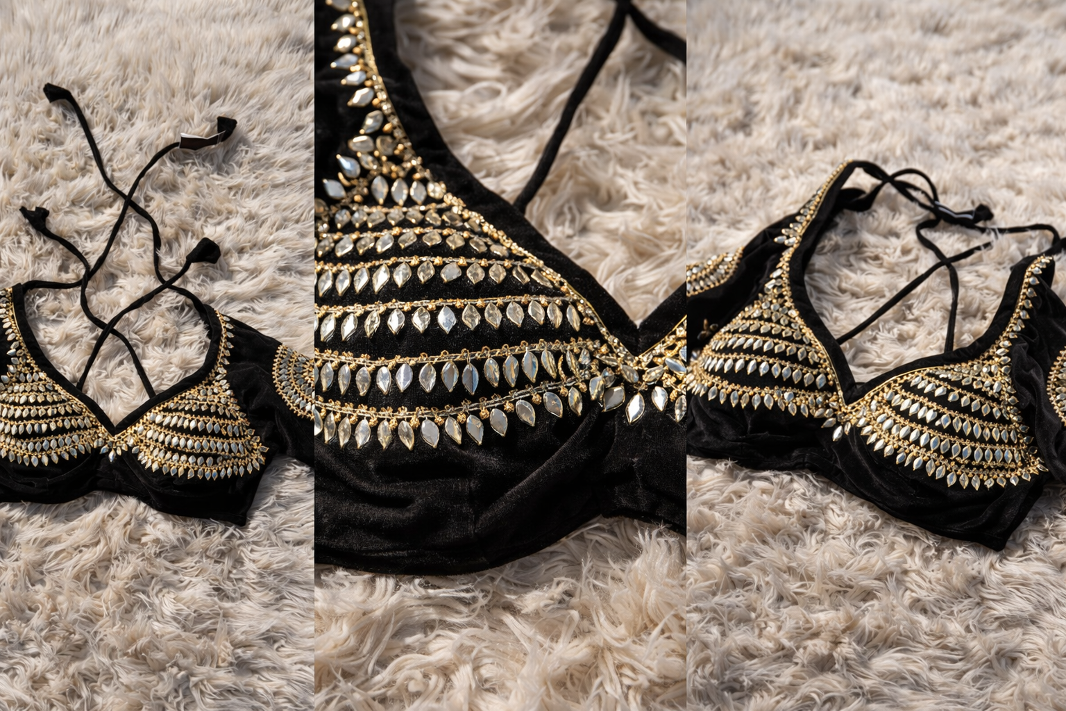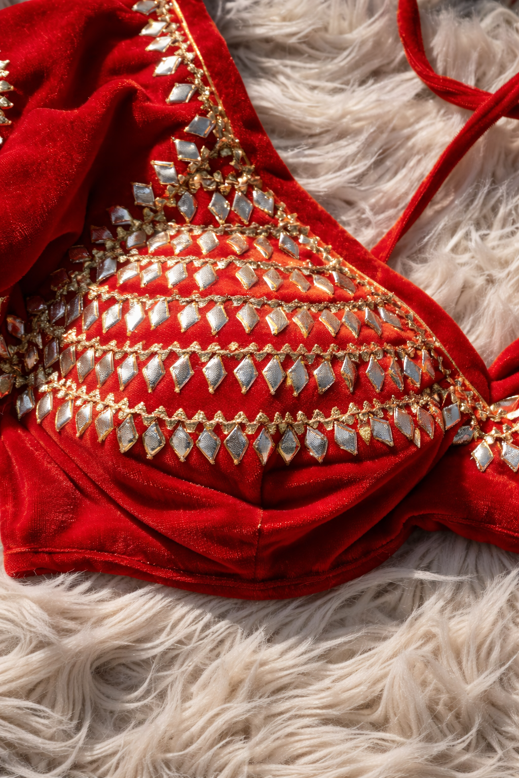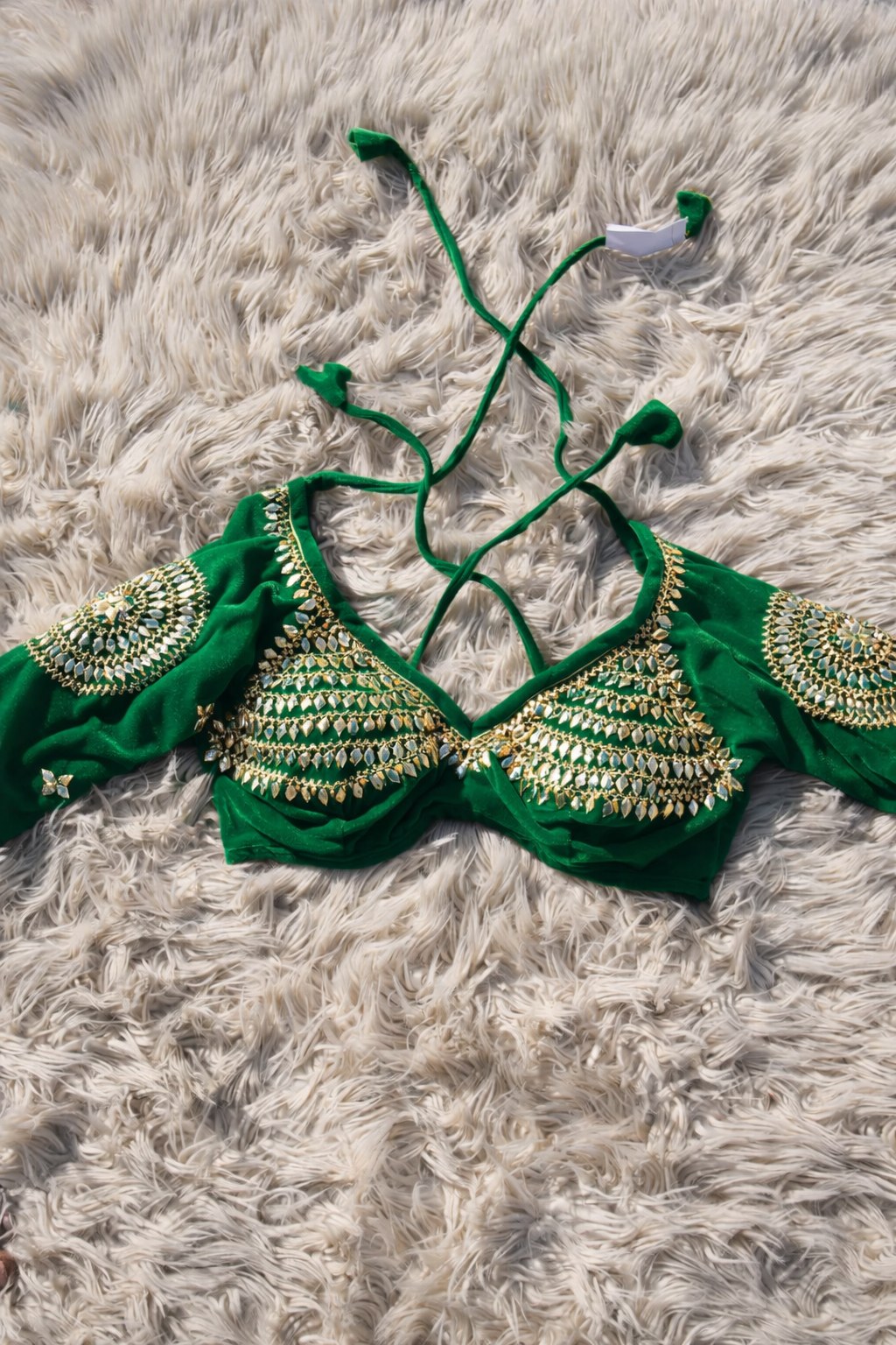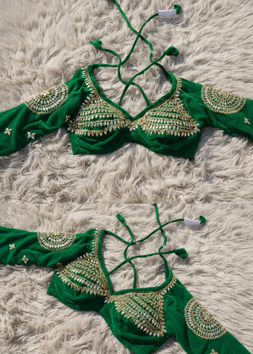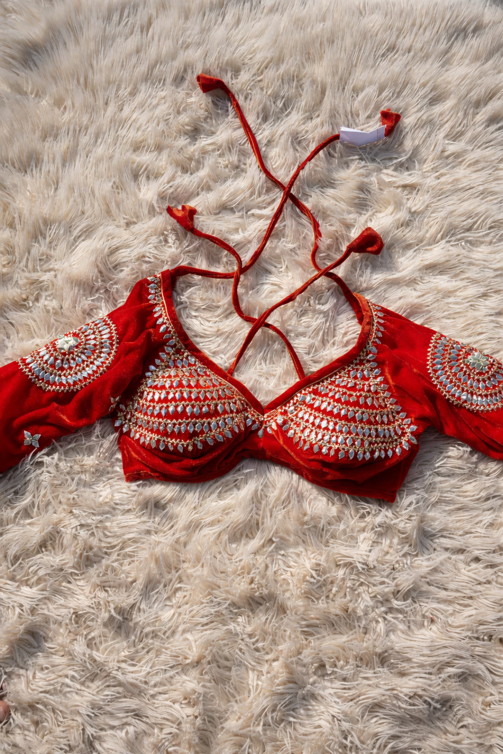 Celebrate traditional craftsmanship with this exquisite Rajasthani handwork Aangi blouse, beautifully adorned with intricate Kachi Gota Patti work. Designed to reflect timeless ethnic elegance, the detailed hand embroidery adds rich texture and heritage charm. Customizable for the perfect fit and style, this blouse is ideal for pairing with sarees or lehengas, making it a stunning choice for festive occasions, weddings, and cultural celebrations.