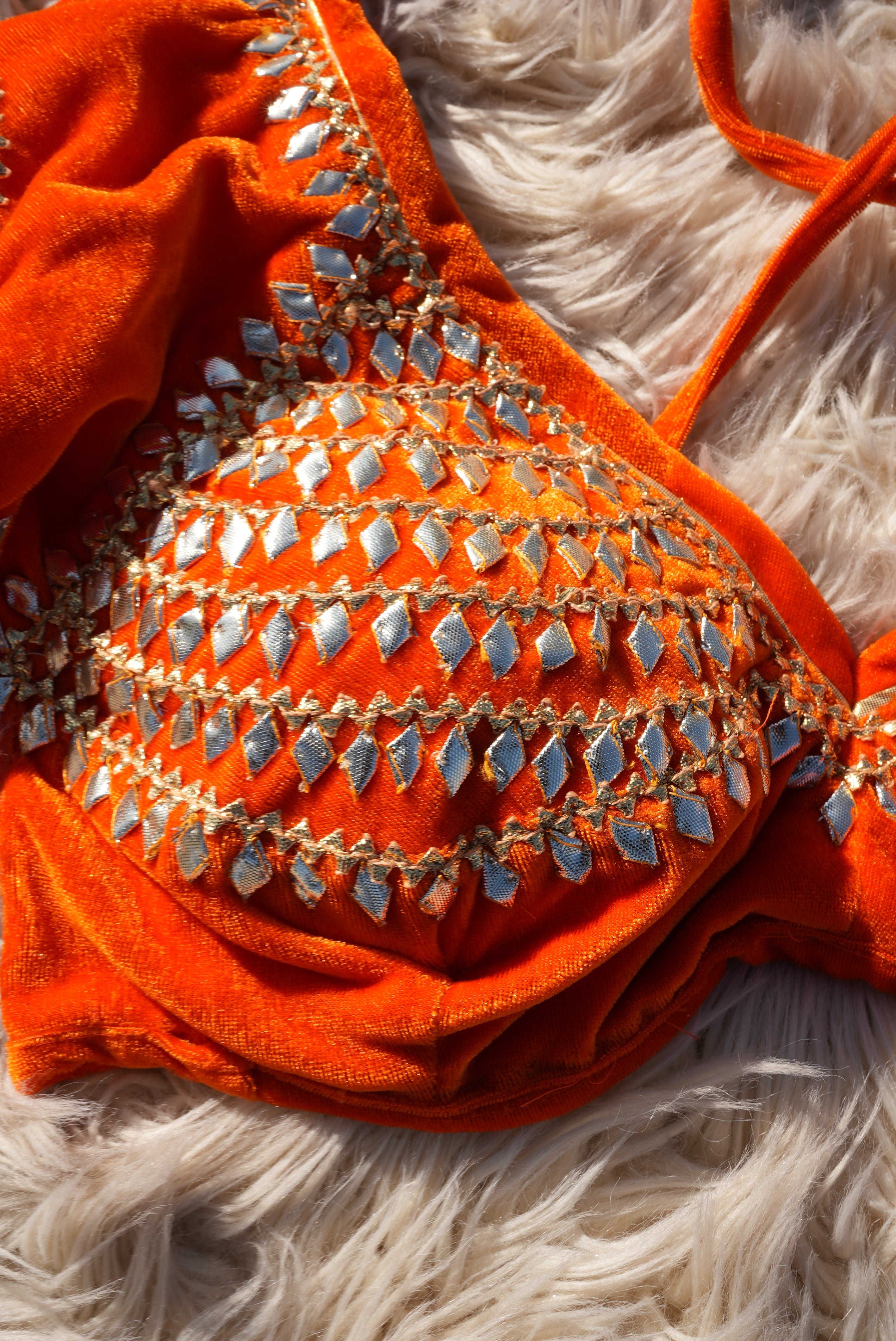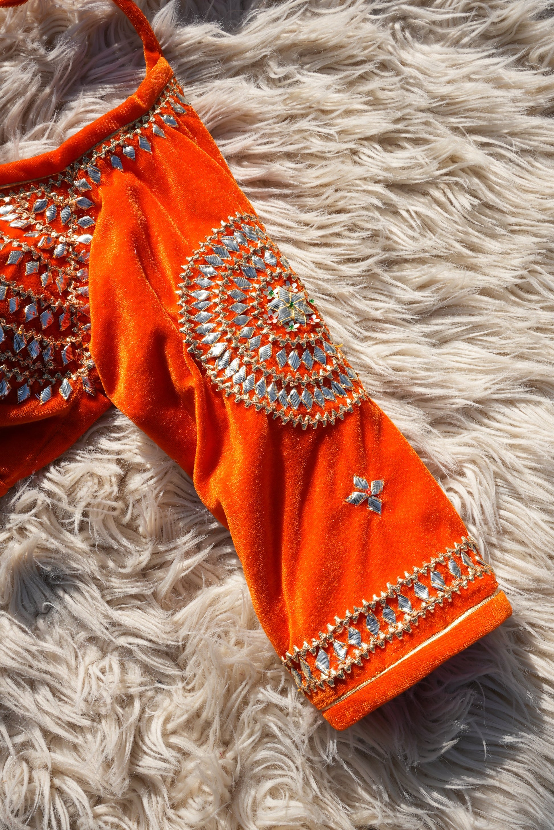 KESARIYA GHUNGHROO RAJASTHANI HANDWORK AANGI BLOUSE WITH KACHI GOTAPATTI WORK (CUSTOMIZABLE) ##HB107