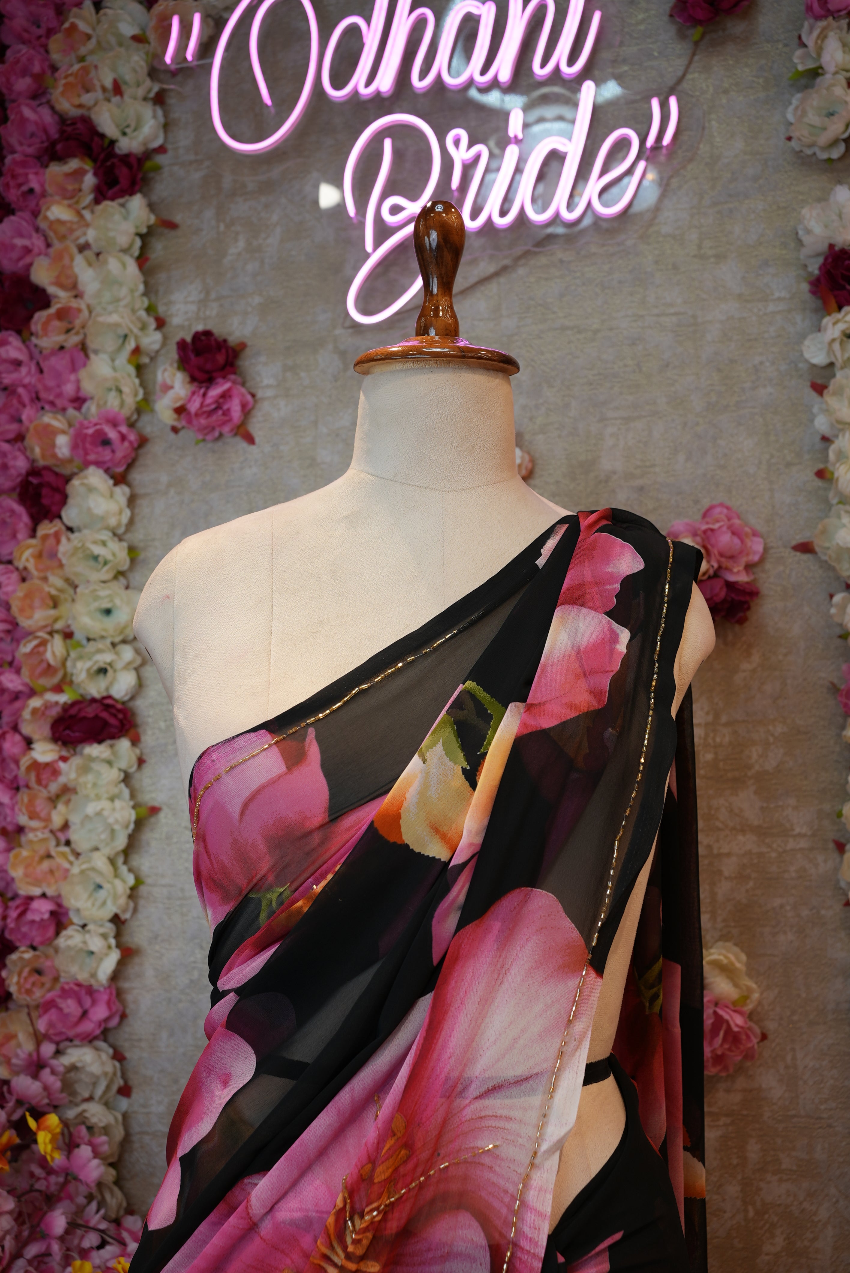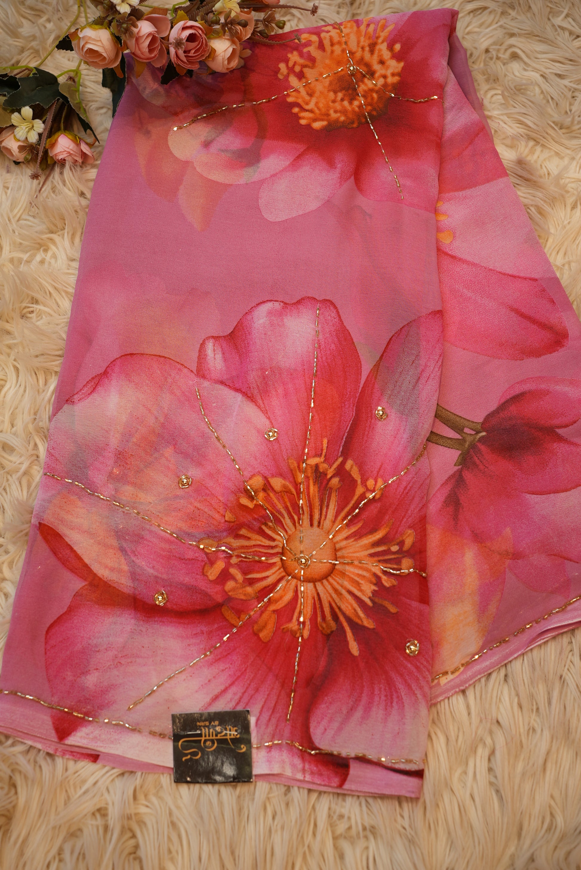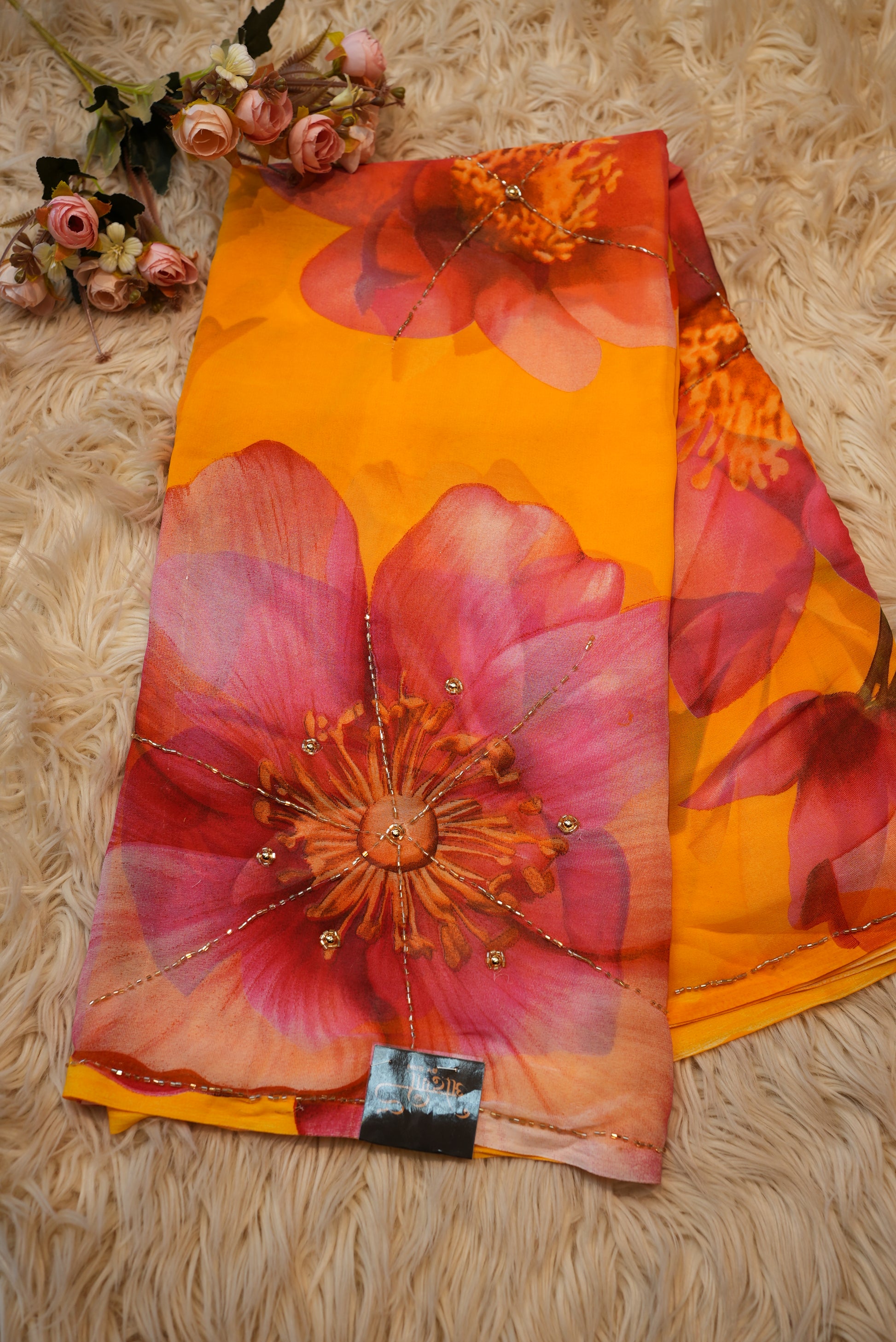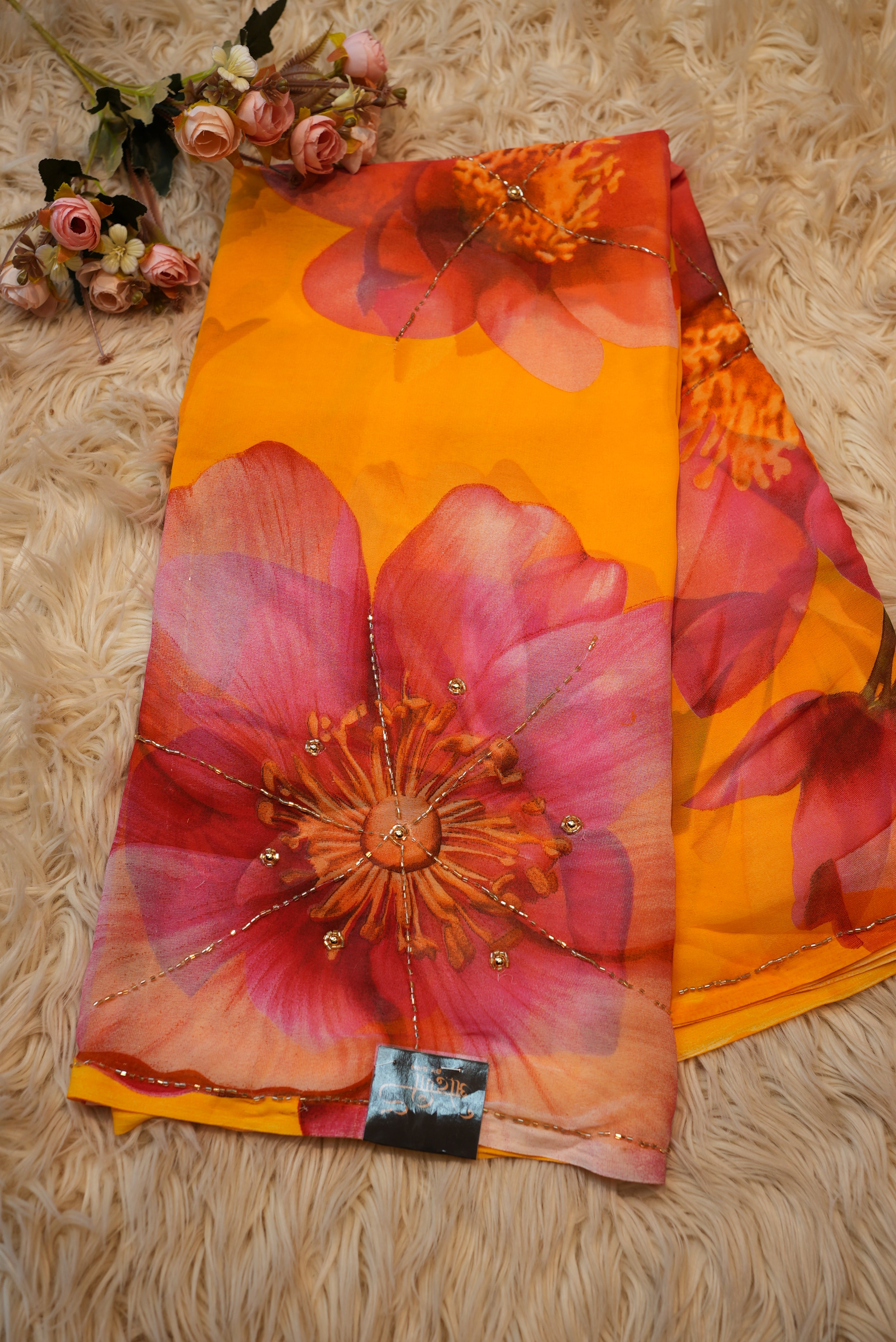 FLOWER PRINT HANDWORK SAREE ON GEORGETTE FABRIC WITH CUT DANA BORDER (WITHOUT BLOUSE) ##SR456