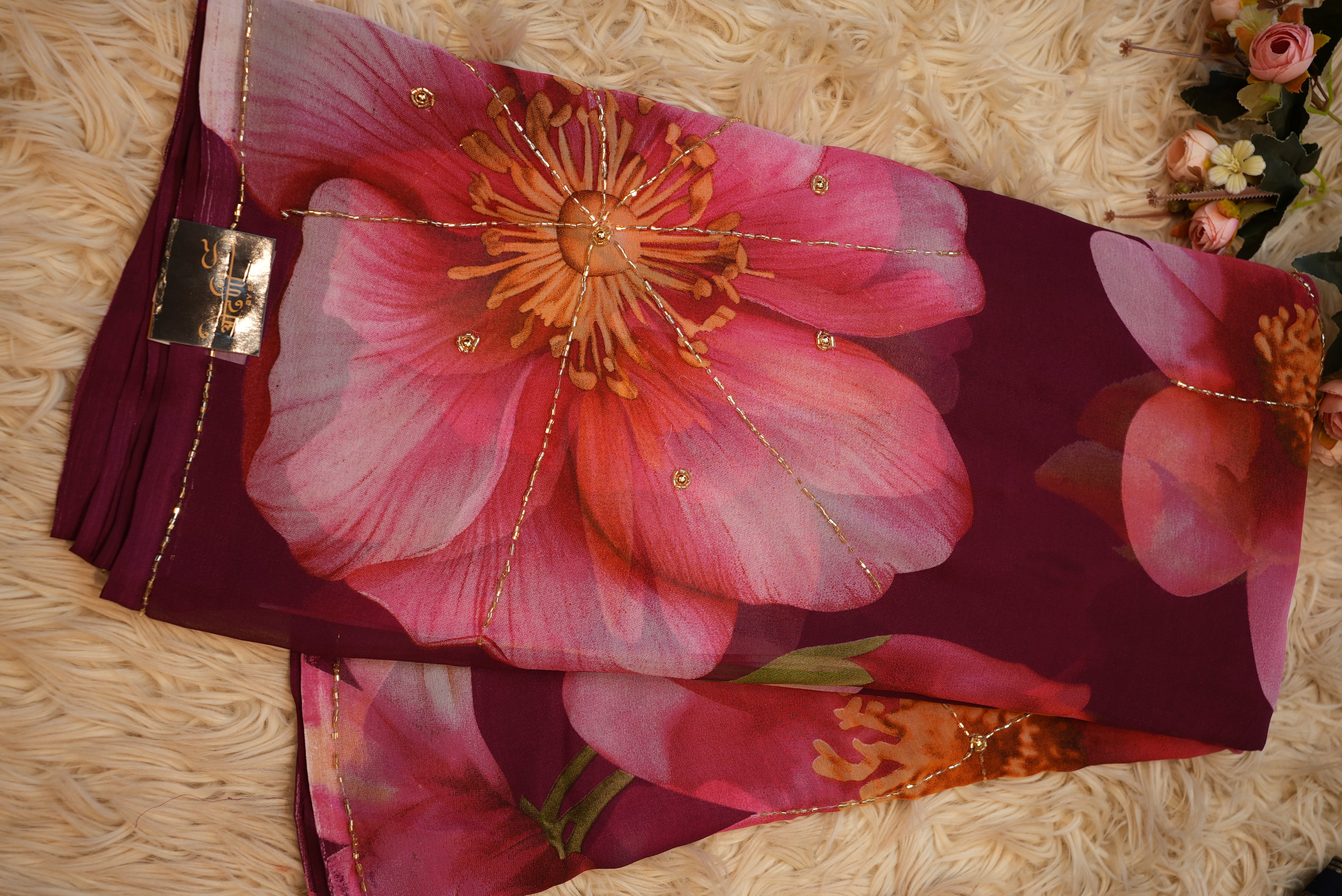 Step into effortless elegance with this Flower Print Handwork Saree, crafted on soft georgette fabric. Highlighted with a delicate Cut Dana border, this saree blends modern charm with traditional craftsmanship. Designed without blouse, it offers you the freedom to style it your way for festive occasions, parties, or casual celebrations.