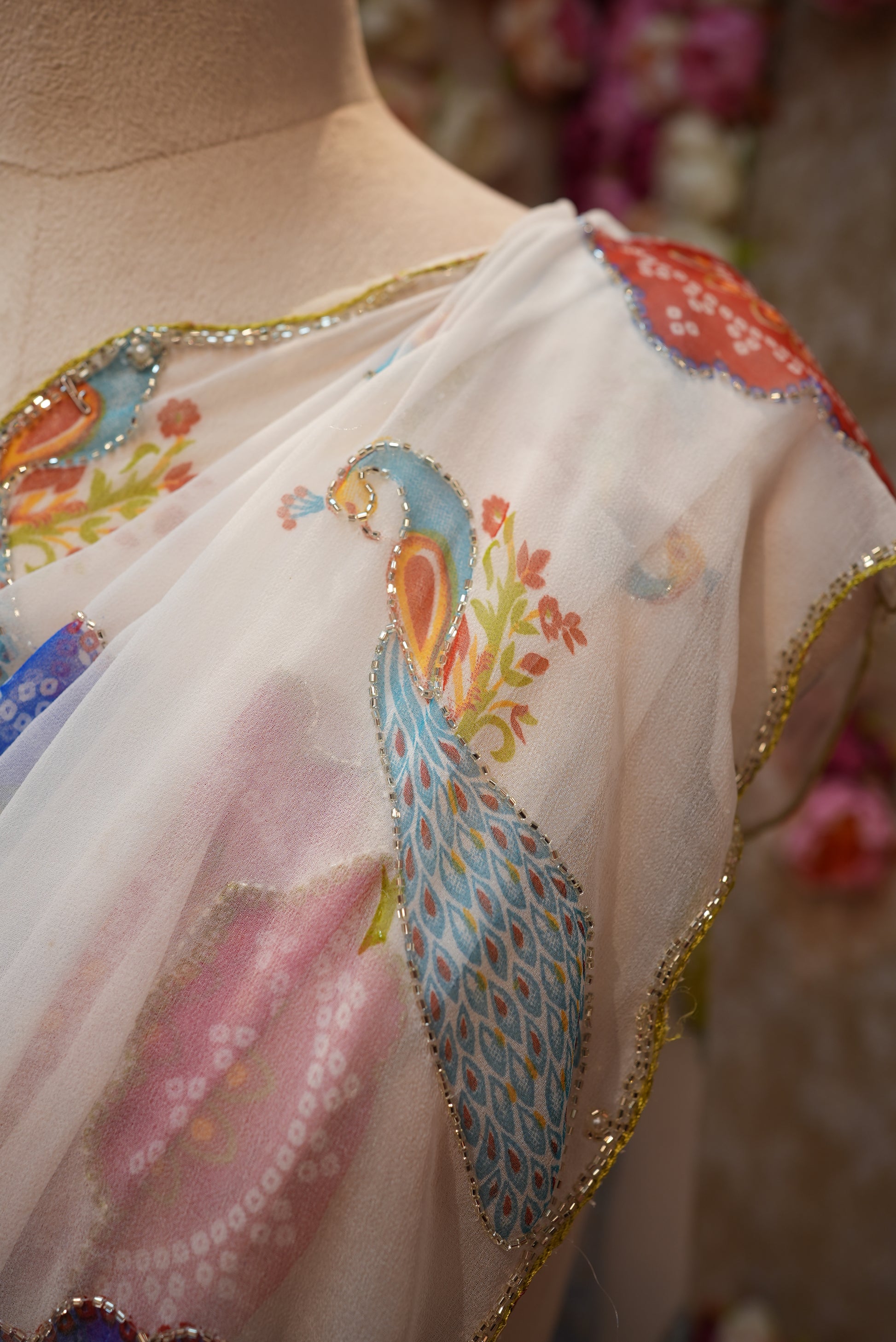 A white base multicolor georgette fabric saree beautifully adorned with mandala bandhani and peacock prints, enhanced with intricate cutdana work. The lightweight georgette drapes gracefully, while the vibrant patterns and delicate embellishments add a touch of elegance and traditional charm, making it perfect for festive occasions and special celebrations.