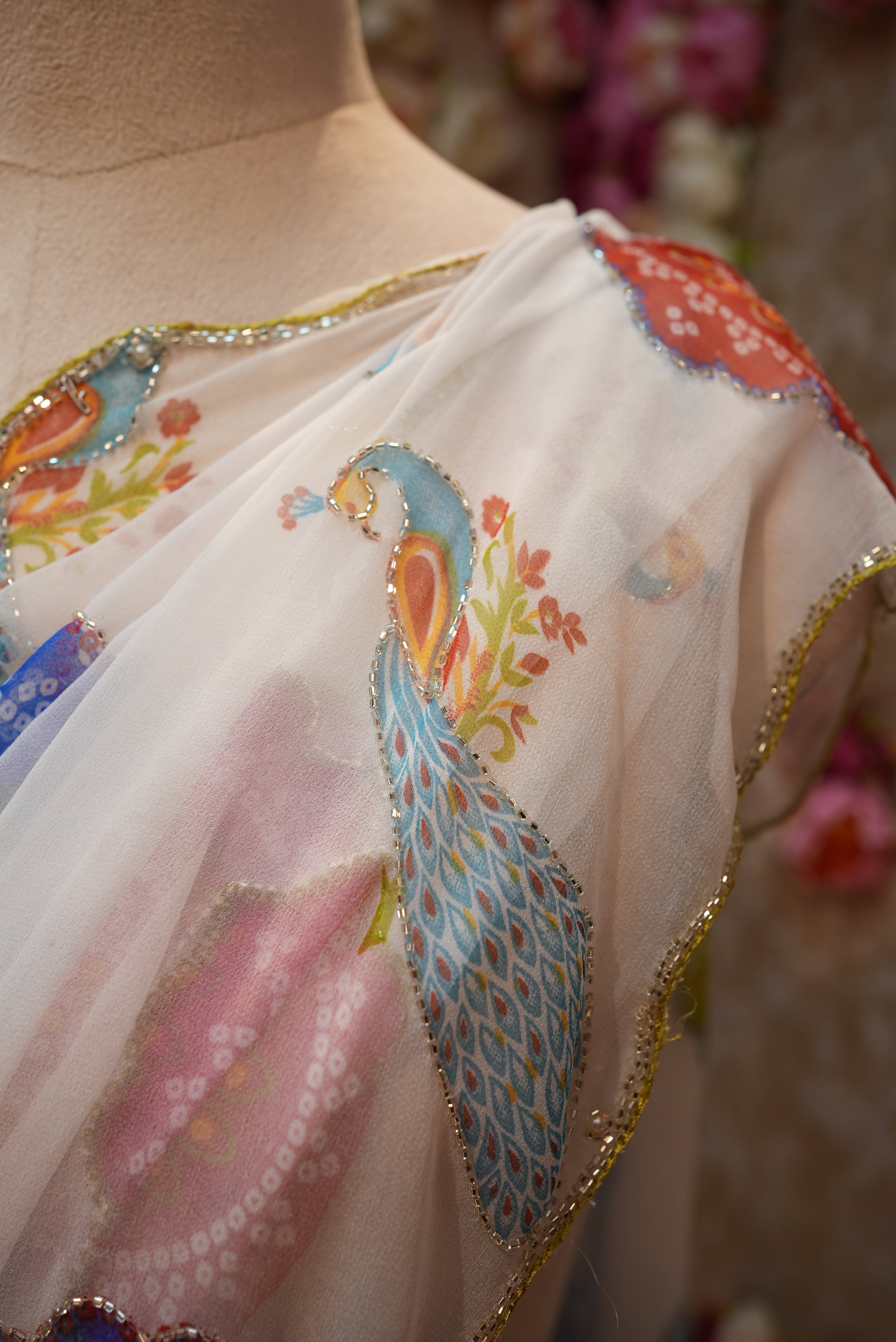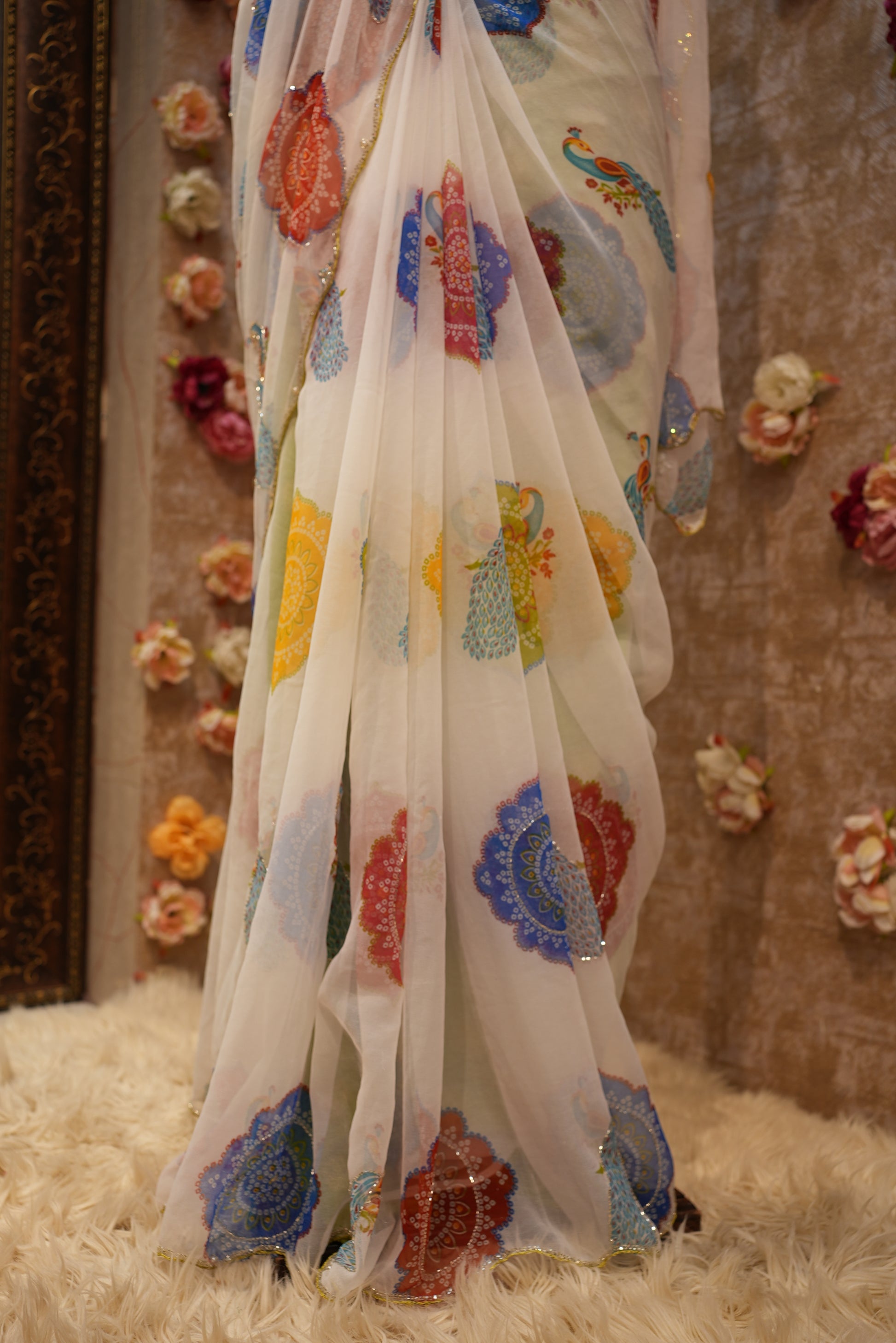 PEACOCK PRINT WHITE BASE MULTICOLOR GEORGETTE FABRIC SAREE WITH MANDALA BANDHANI AND CUTDANA WORK (WITH BLOUSE) ##SR604