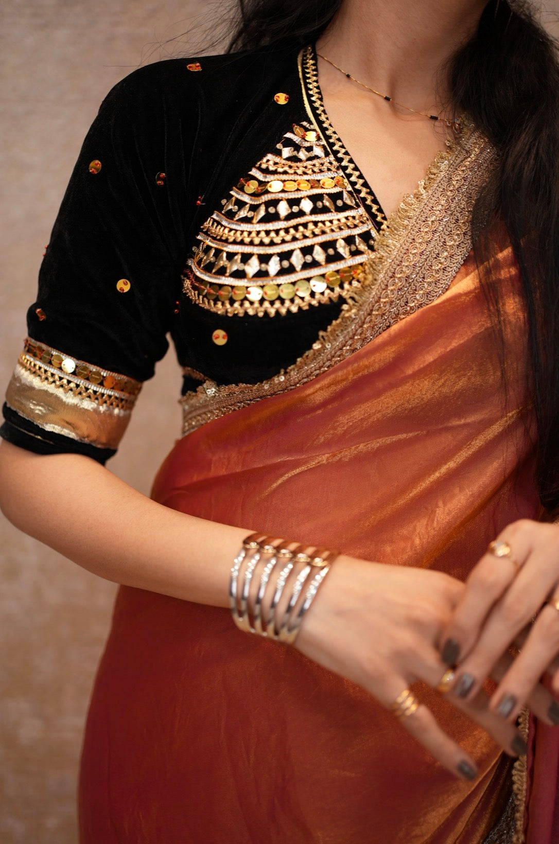 A beautiful Rajasthani Angi blouse accompanied by a Sabyasachi designer lace saree that exquisitely captures the essence of Indian heritage with a dash of opulence.” The Angi blouse is adorned with classic Rajasthani work; therefore, it provides a beautiful cultural essence to the attire, while the designer lace saree brings a pinch of sophistication and elegance to it. Additionally, it also comes with a matching blouse; hence, it serves as a complete set to wear on occasions such as weddings or celebrations.