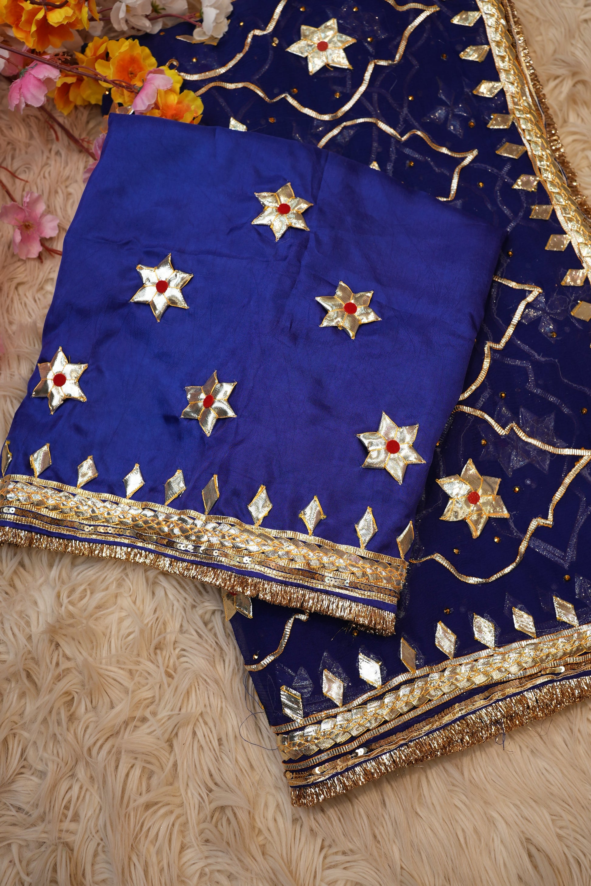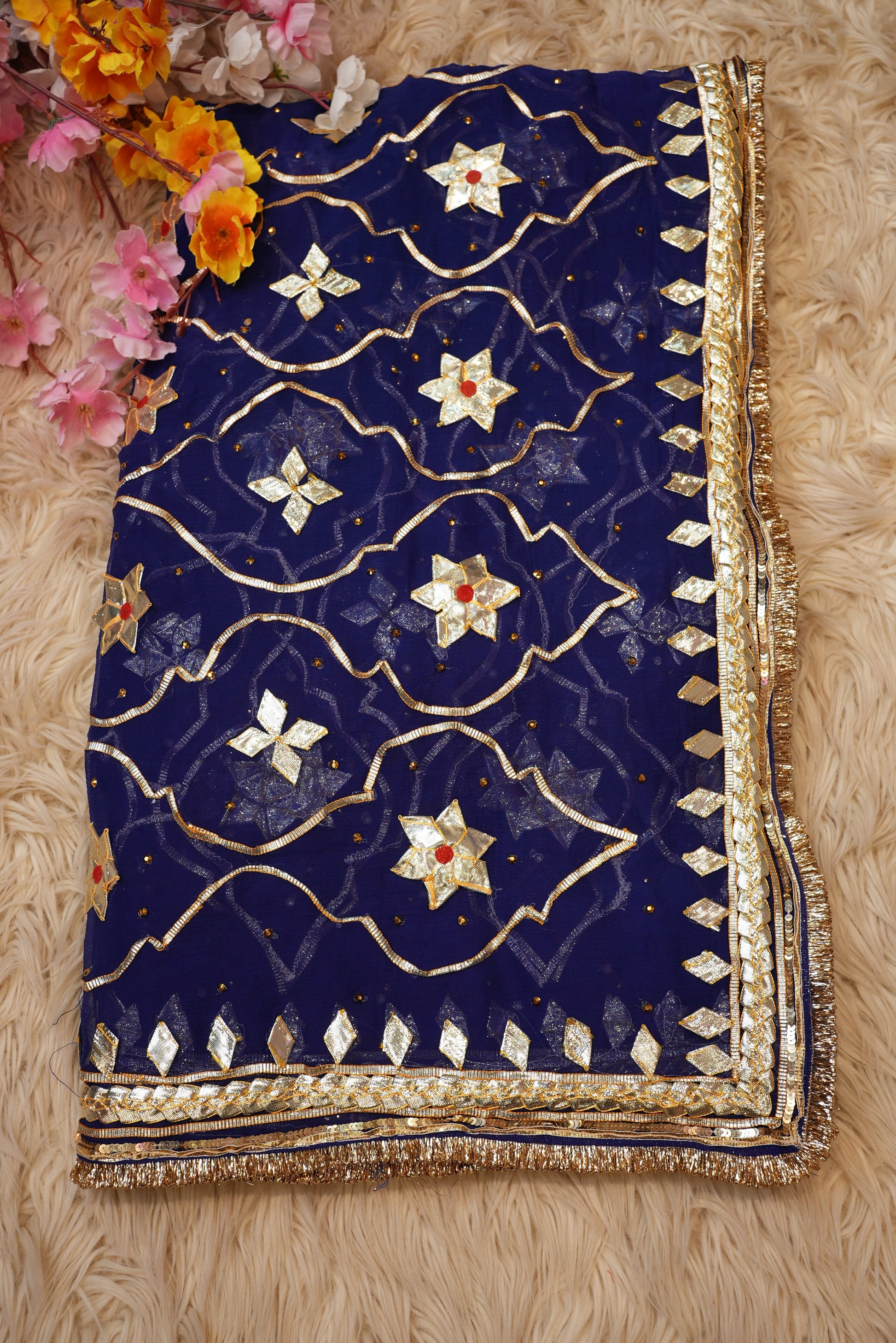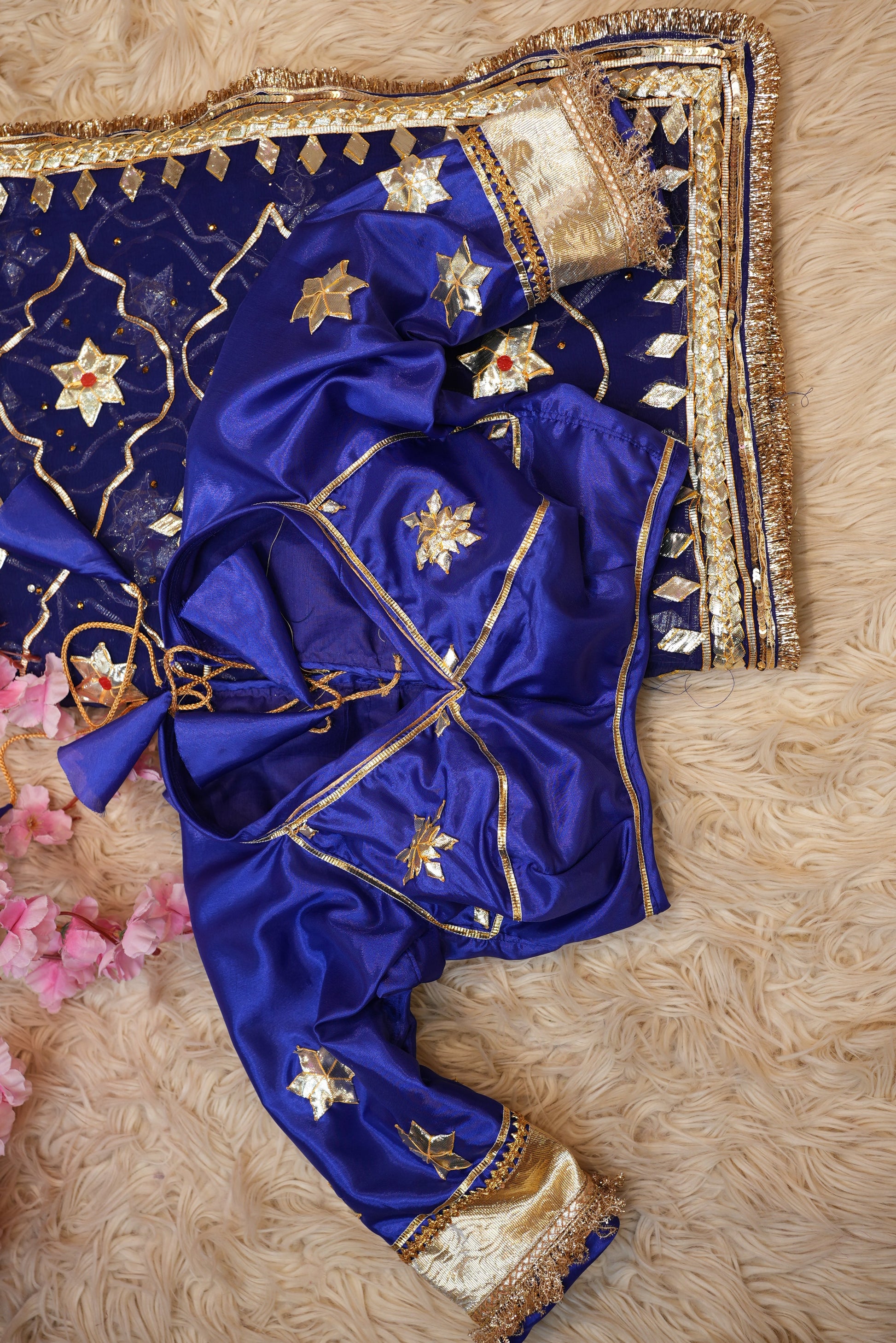 Experience the essence of royal tradition with this Chiffon fabric saree, beautifully adorned with Rajasthani Kachi Gota Patti handwork. The saree features a heavy Jaal pattern, showcasing intricate craftsmanship that exudes timeless elegance. Made from premium-quality chiffon, it offers a soft, lightweight, and graceful drape — perfect for festive occasions, weddings, and cultural celebrations. The ensemble is paired with an elegant Angi blouse, completing your regal ethnic look with sophistication and styleS.