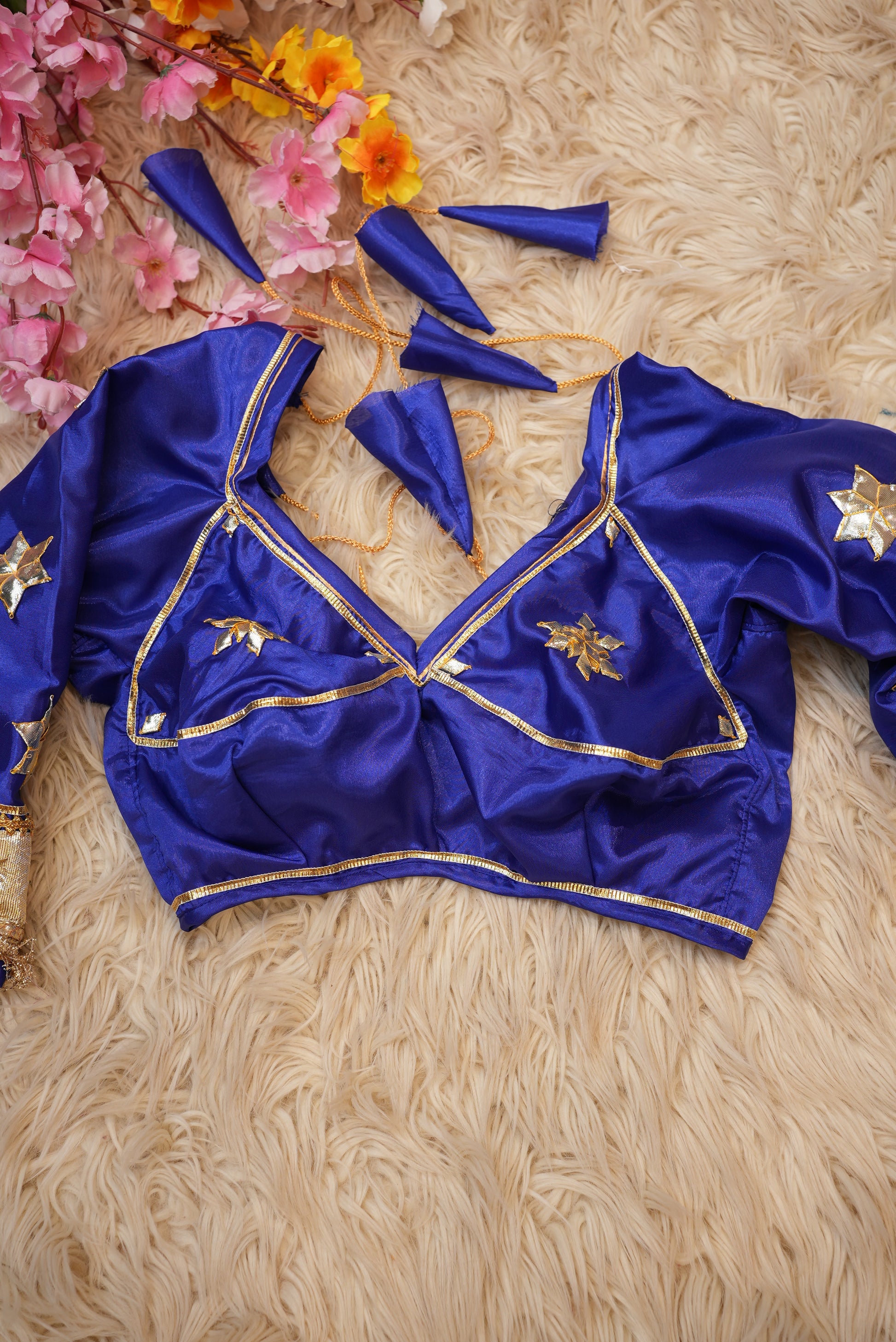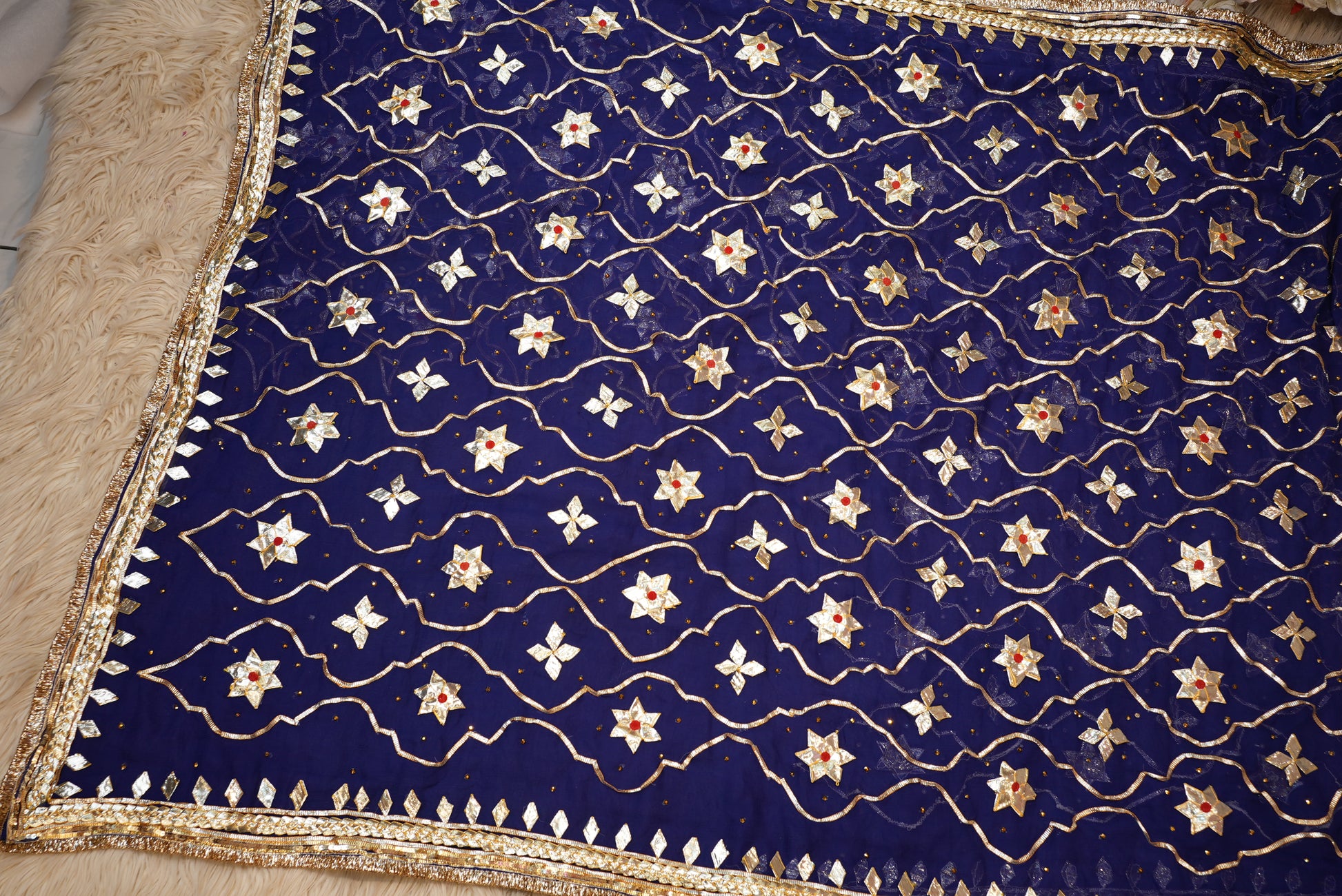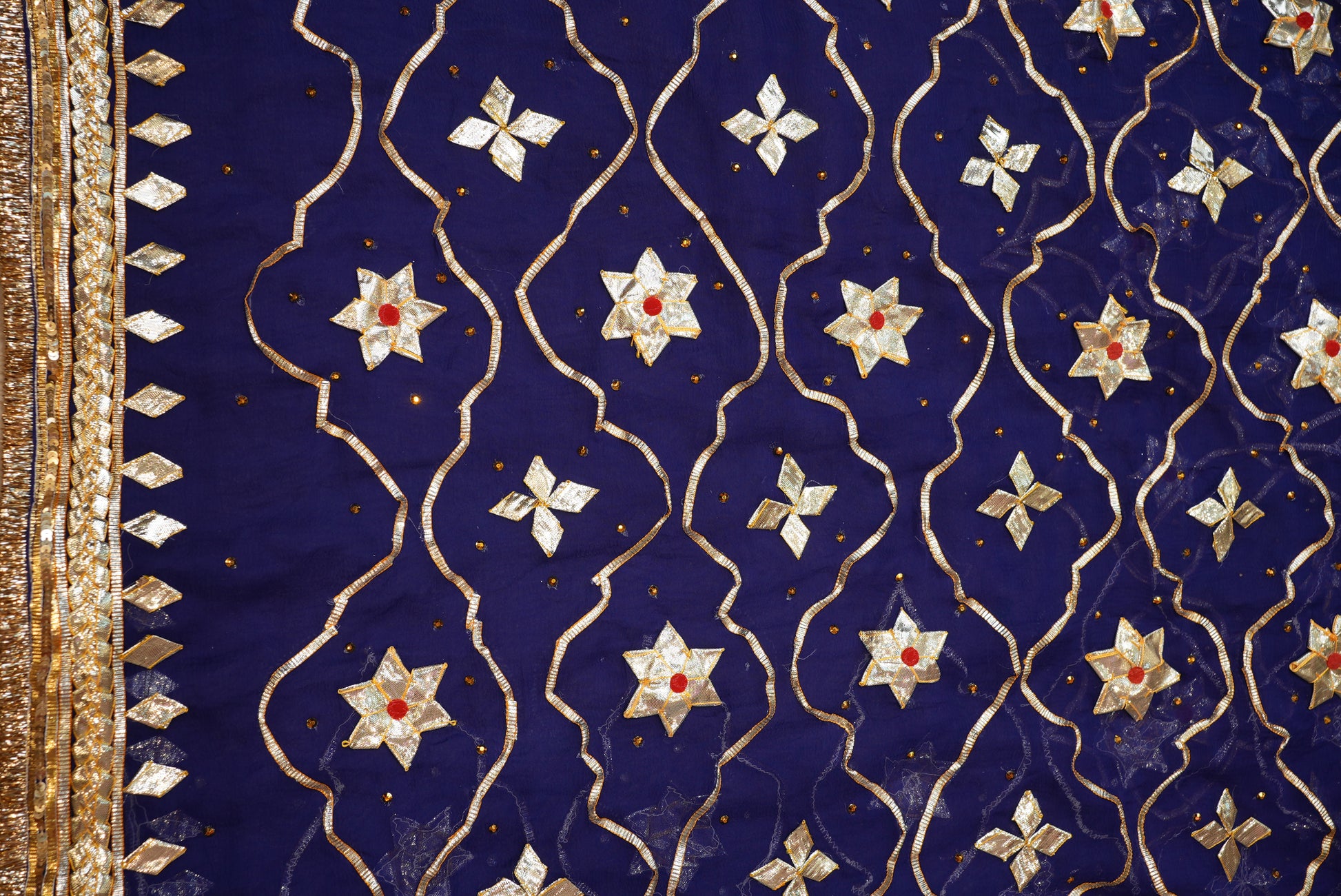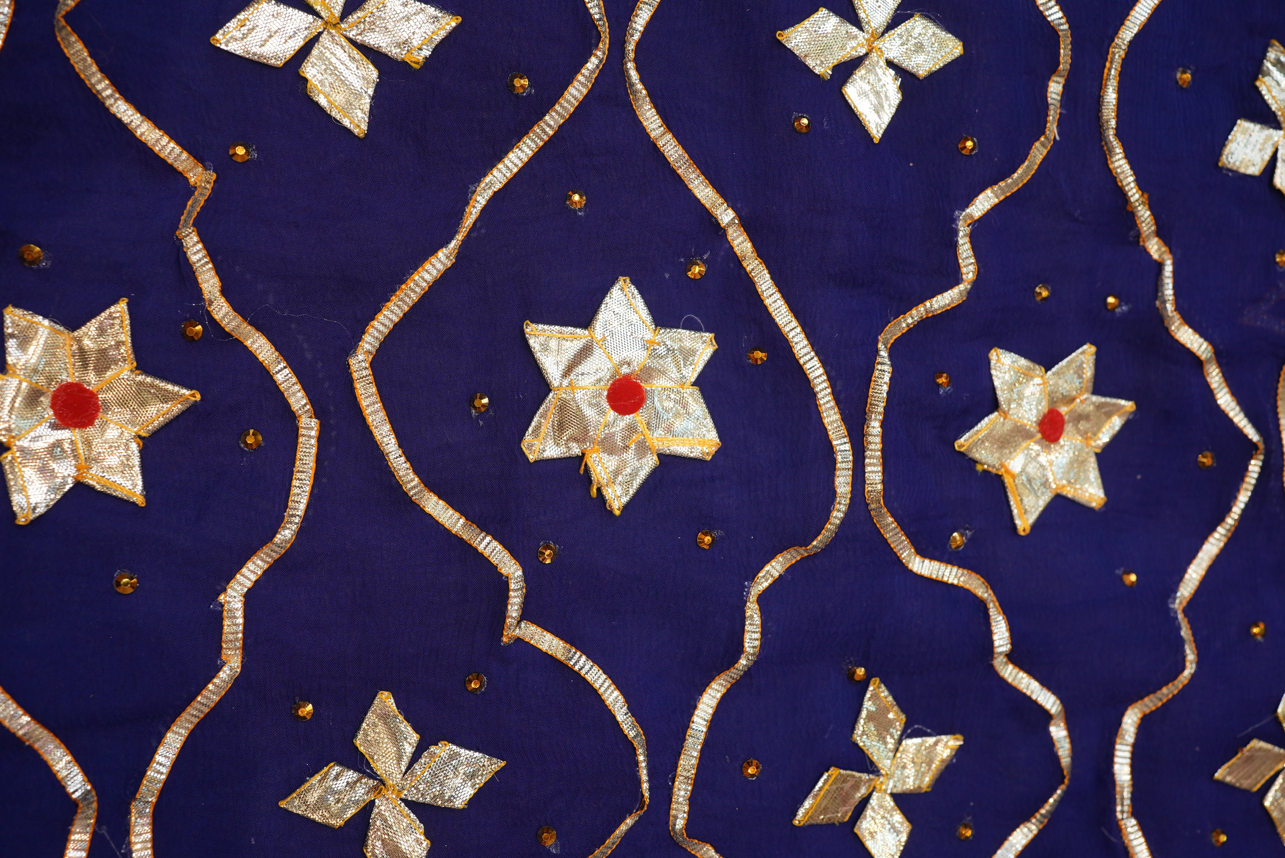 Experience the essence of royal tradition with this Chiffon fabric saree, beautifully adorned with Rajasthani Kachi Gota Patti handwork. The saree features a heavy Jaal pattern, showcasing intricate craftsmanship that exudes timeless elegance. Made from premium-quality chiffon, it offers a soft, lightweight, and graceful drape — perfect for festive occasions, weddings, and cultural celebrations. The ensemble is paired with an elegant Angi blouse, completing your regal ethnic look with sophistication and styleS.
