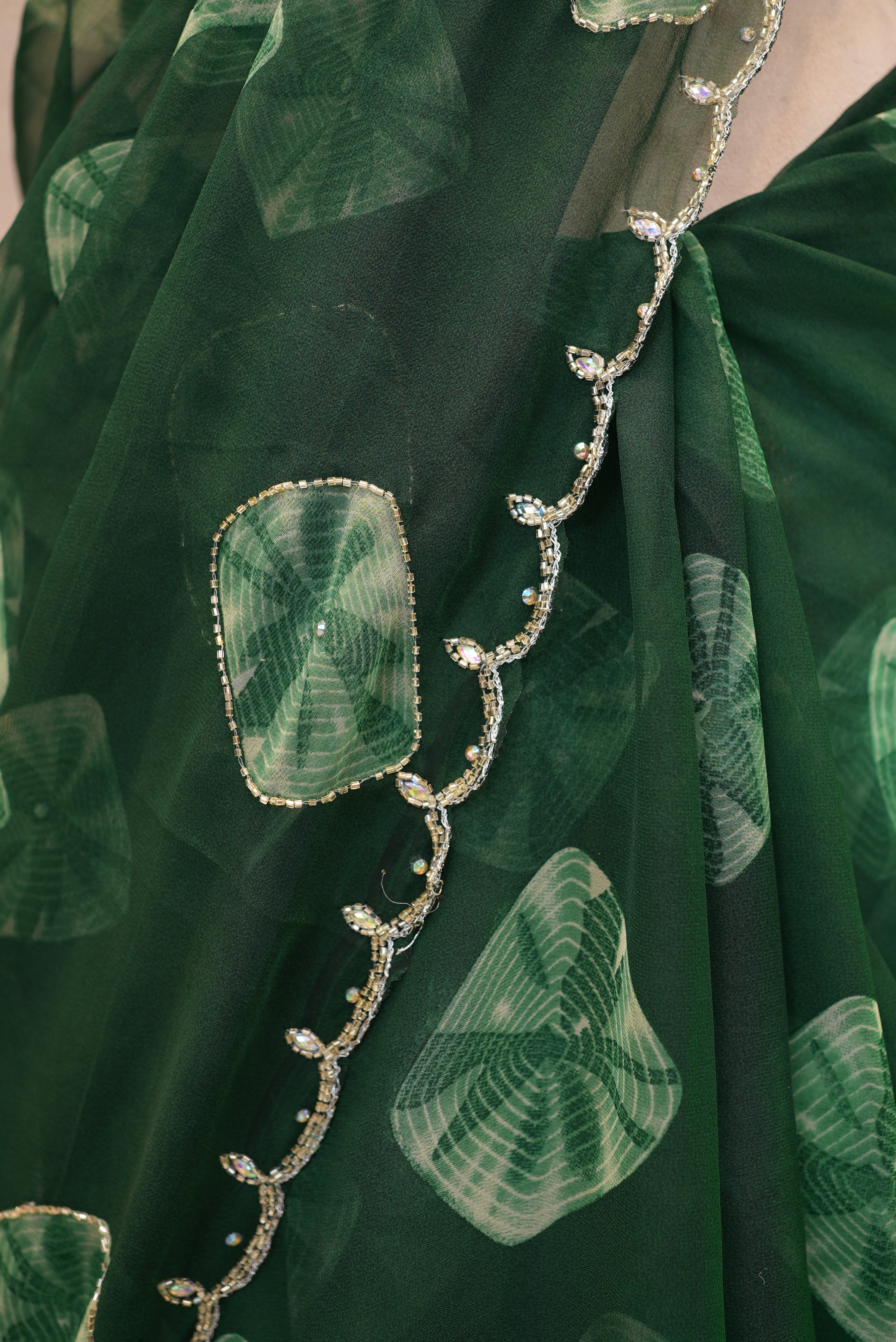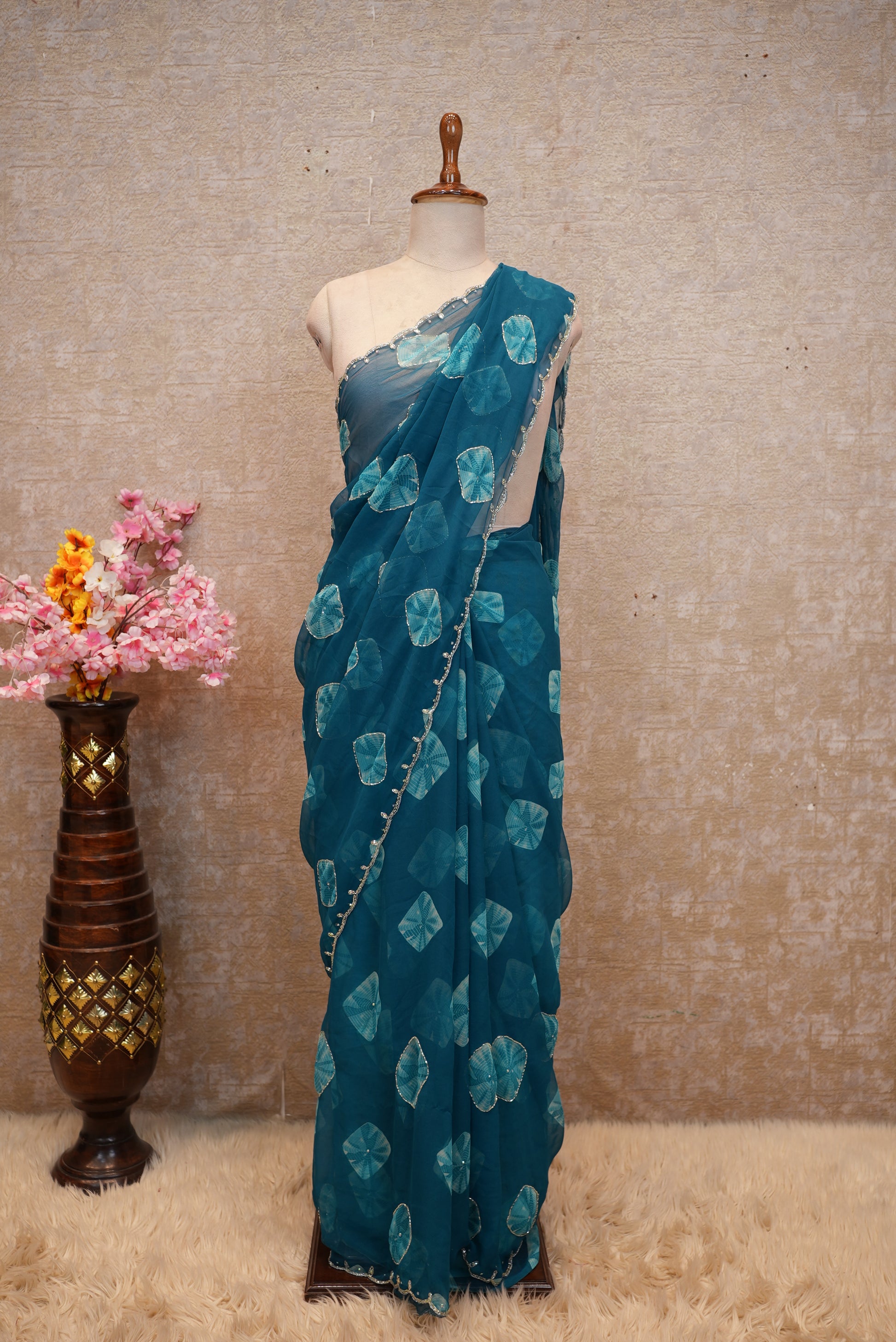 Experience effortless elegance with this chiffon fabric washable handwork saree, designed for both comfort and sophistication. The saree features exquisite Bandhej detailing paired with a beautifully crafted cutwork border, adding a rich traditional touch to its modern lightweight drape. Paired with a matching blouse, this ensemble is perfect for festive occasions, celebrations, and graceful everyday wear.