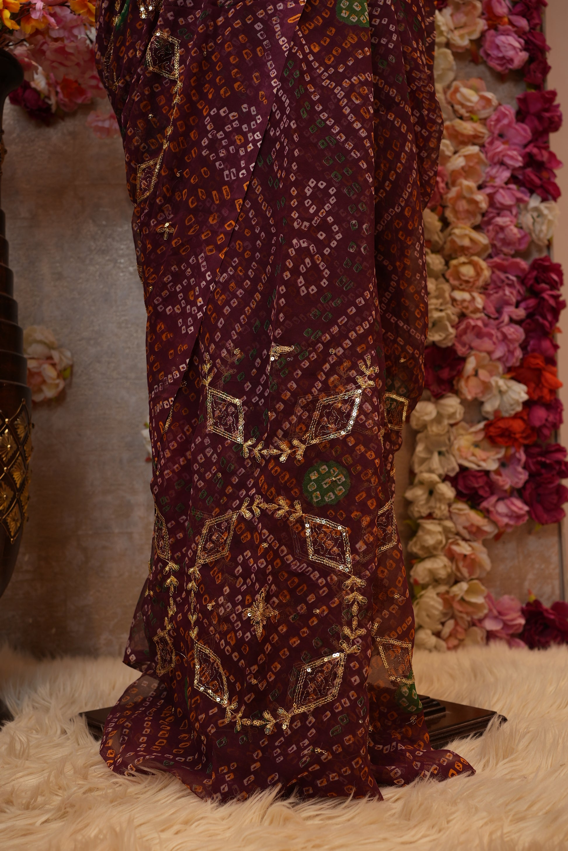 This exquisite saree is crafted with a traditional Bandhani design, beautifully enhanced by an elegant Aari Tari heavy jaal pattern. The intricate detailing adds richness and grandeur, making it perfect for weddings, festive occasions, and celebrations. Designed with blouse, it offers a complete and graceful ensemble that reflects timeless artistry with a regal touch.
