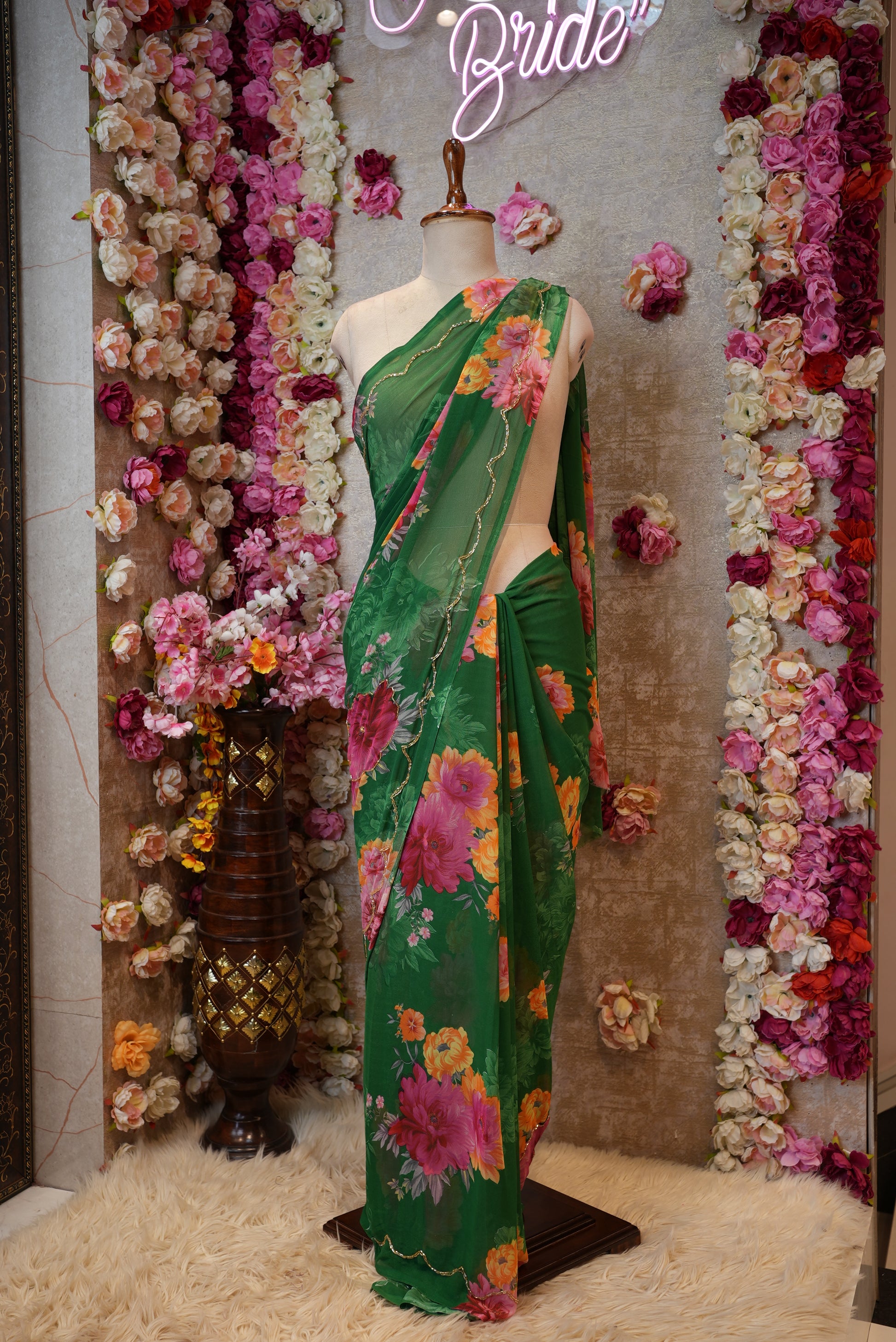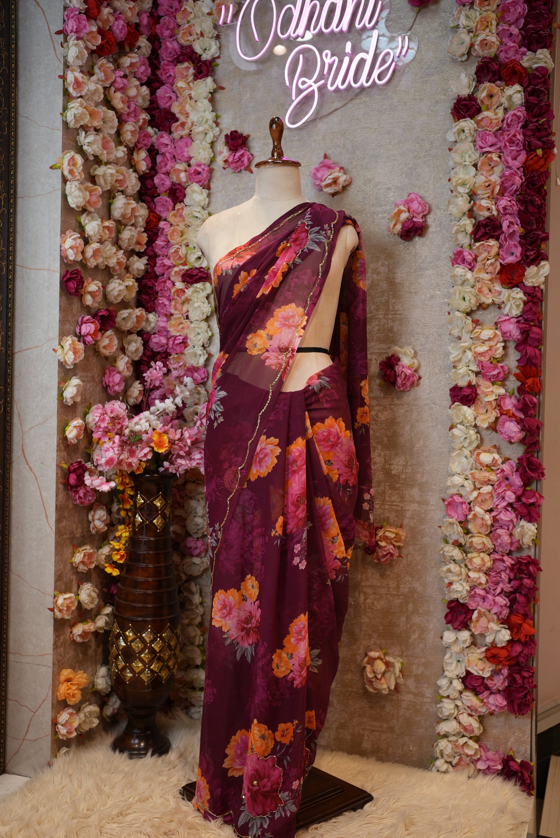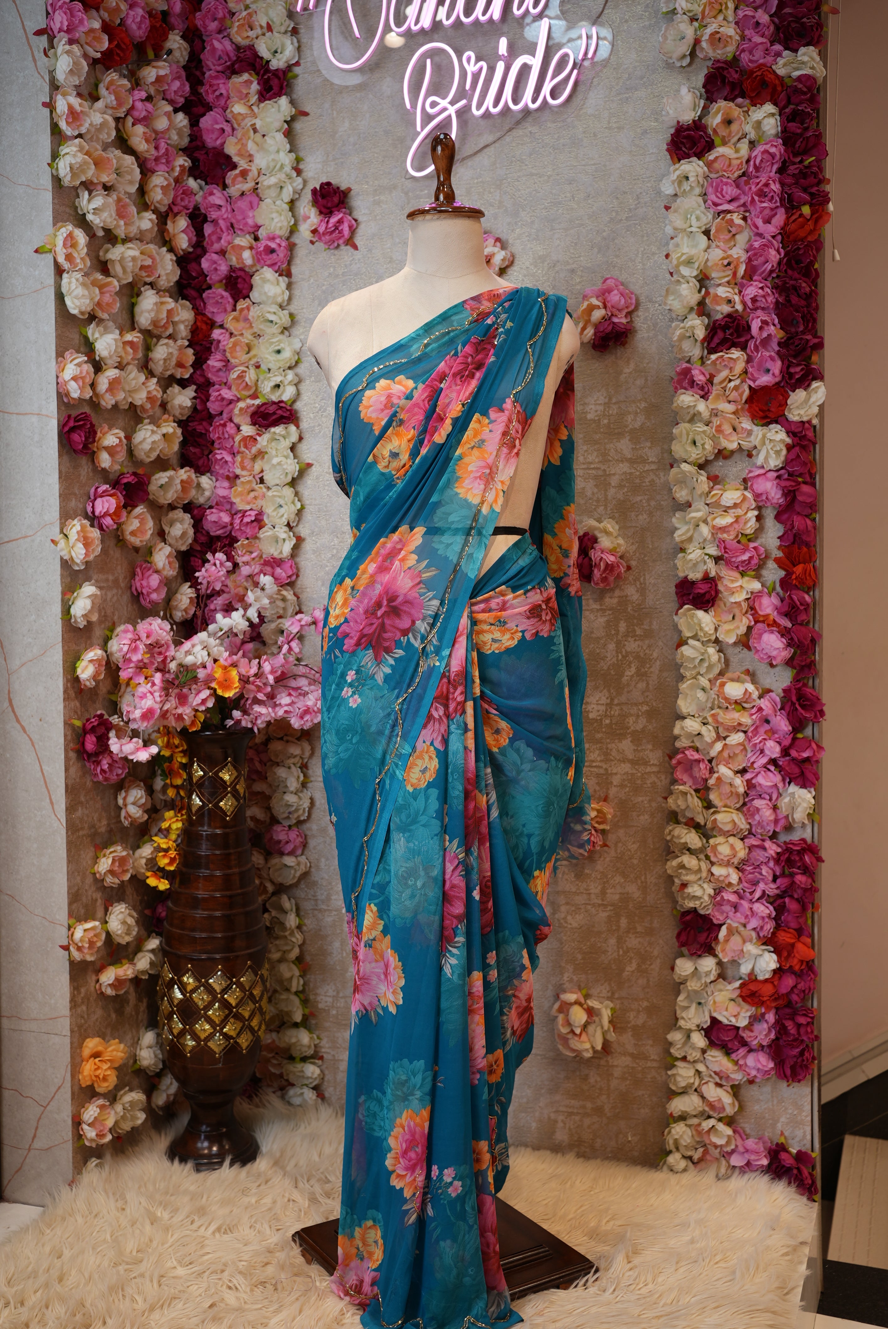 Elevate your ethnic wardrobe with this flower print saree crafted from lightweight and flowy georgette fabric. The saree features intricate cutdana work that adds a subtle shimmer and refined elegance to its floral design. Perfect for festive occasions or casual celebrations, this saree drapes beautifully, offering both comfort and grace. (Note: This saree comes without a blouse piece.)