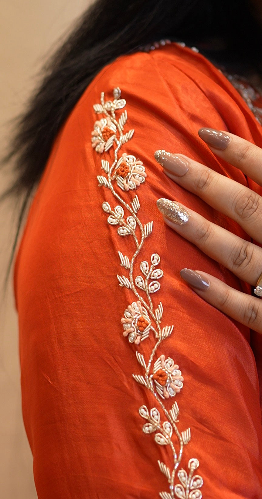 A stunning rust orange colour 3-piece suit crafted with elegant detailing. The outfit features exquisite zardozi and beats work, adding richness and traditional charm to the ensemble. Paired with a luxurious Banarasi dupatta, this set beautifully blends timeless craftsmanship with a sophisticated, festive appeal.