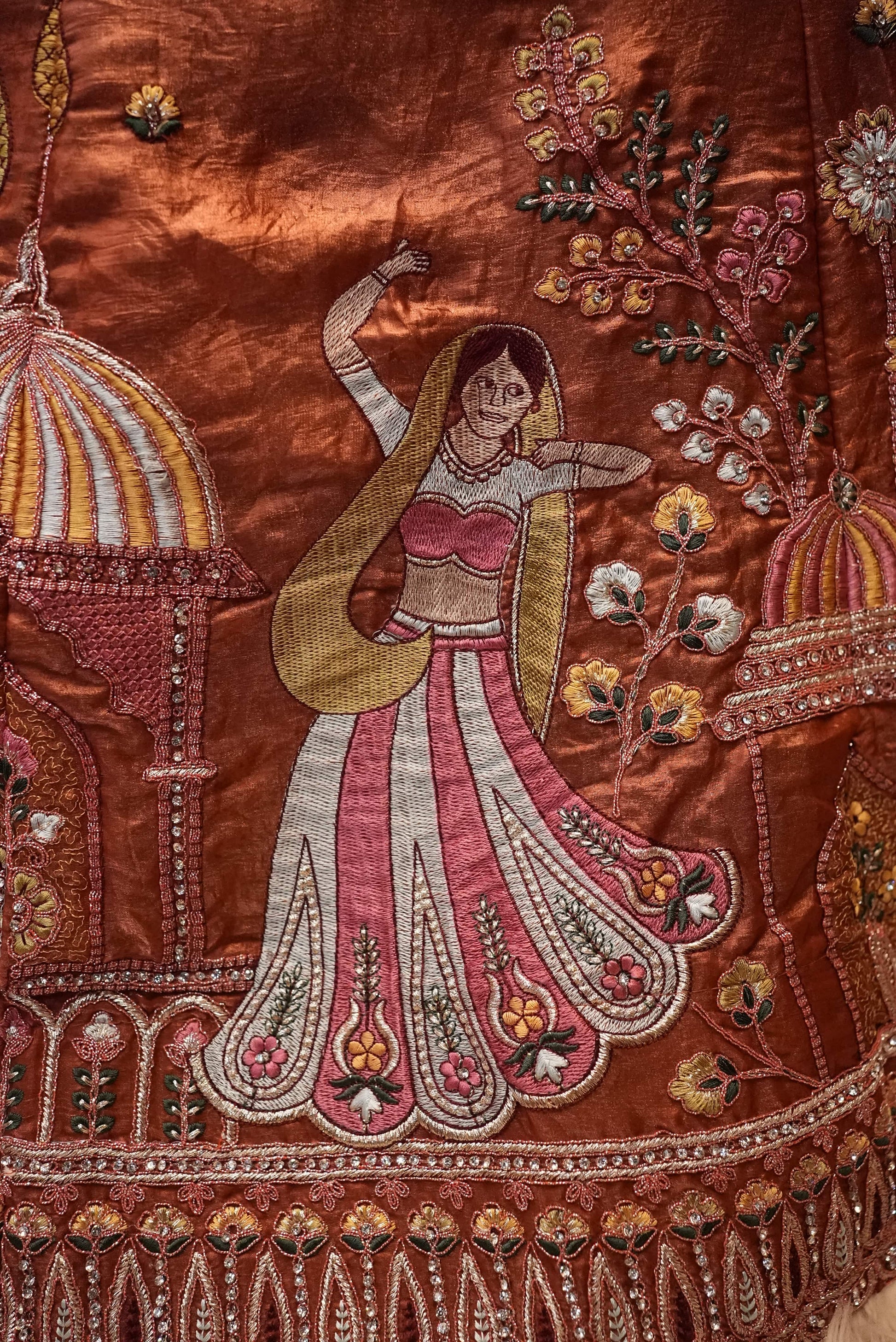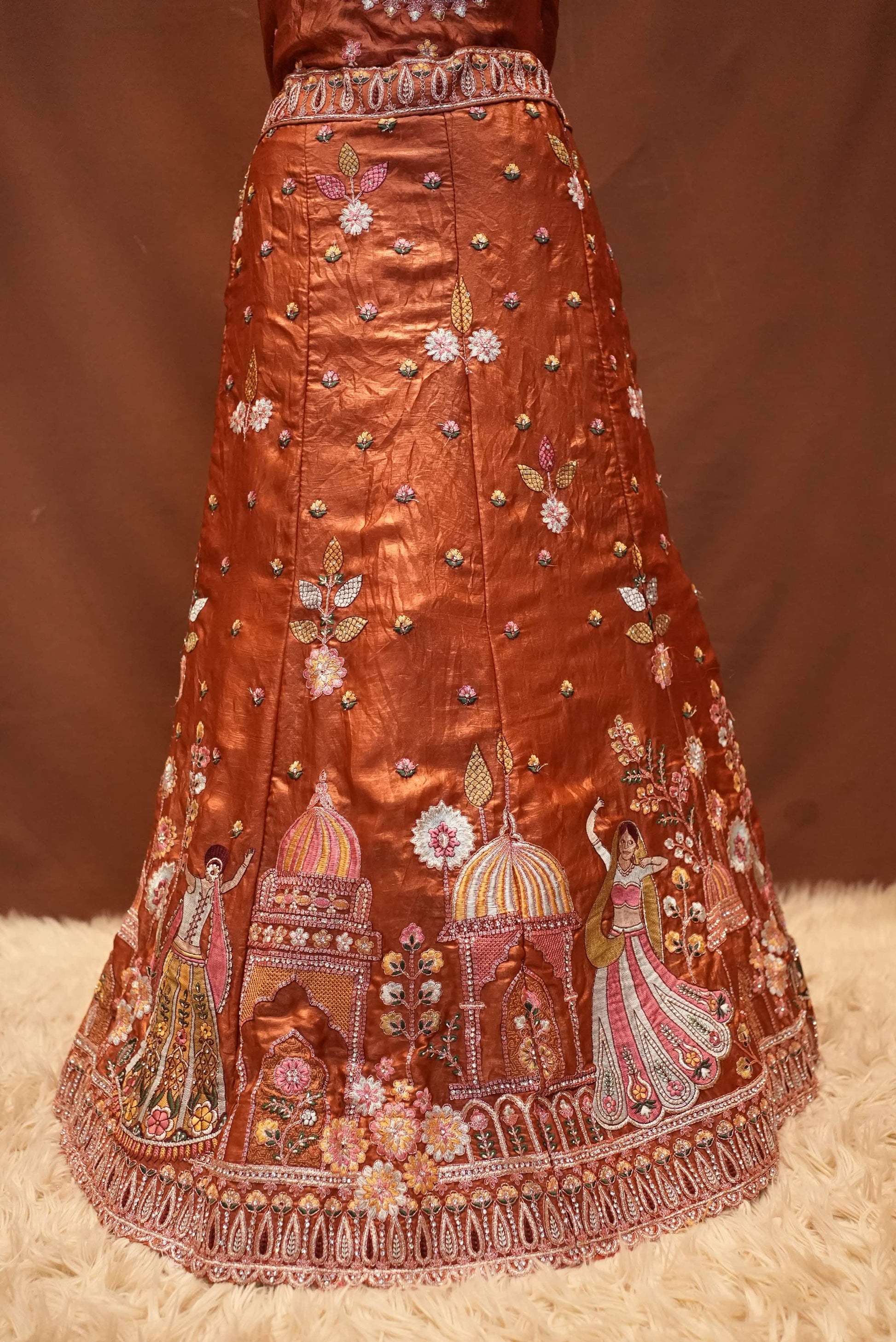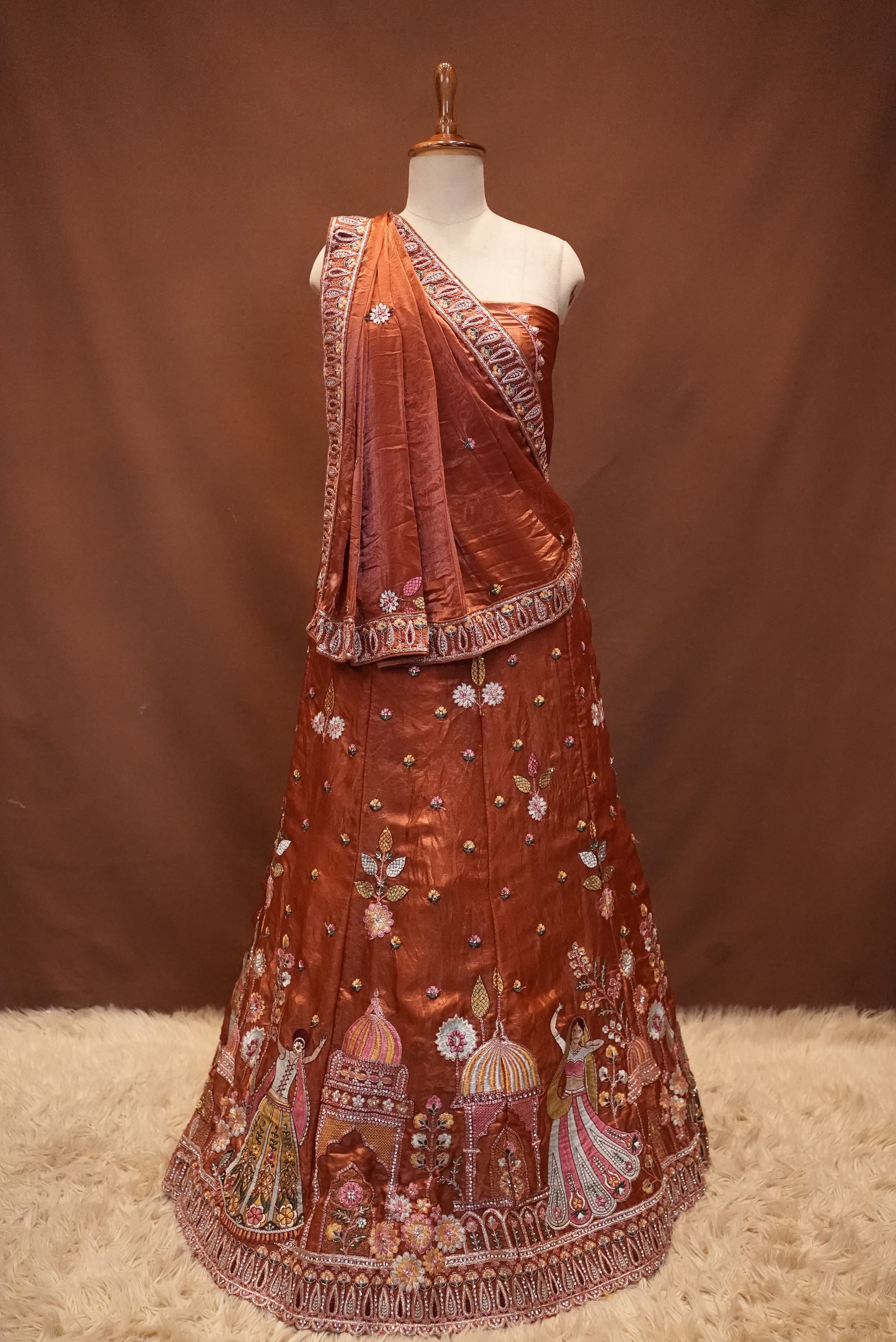 This luxurious Fendi fabric lehenga makes for a royal statement with beautiful intricate Darbari motifs and shimmering sequin work. The rich texture of the fabric enhances its royal appeal, while the detailed craftsmanship adds festive elegance. Paired with a heavy embellished dupatta, this lehenga is an ideal choice for weddings, receptions, and grand celebrations.