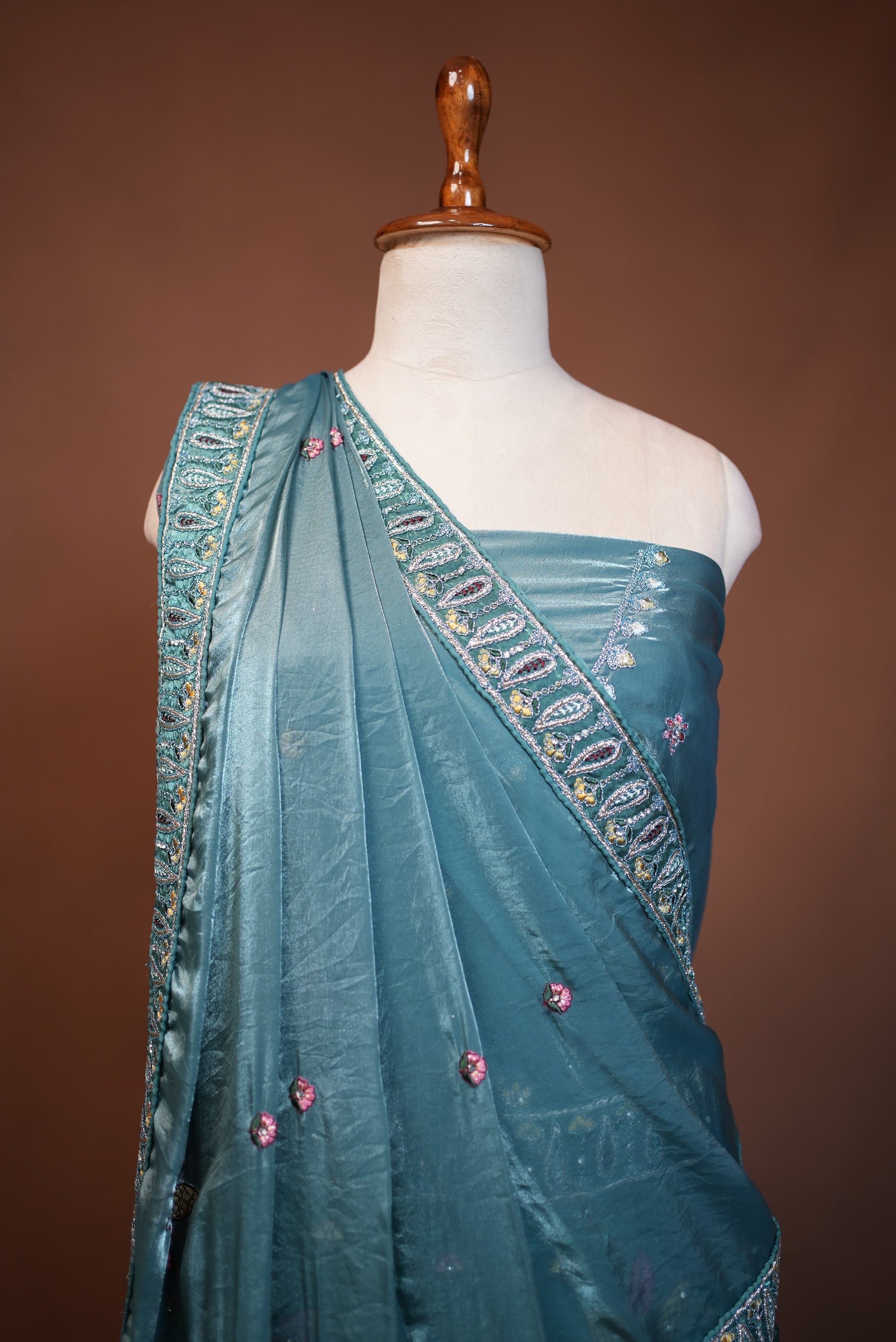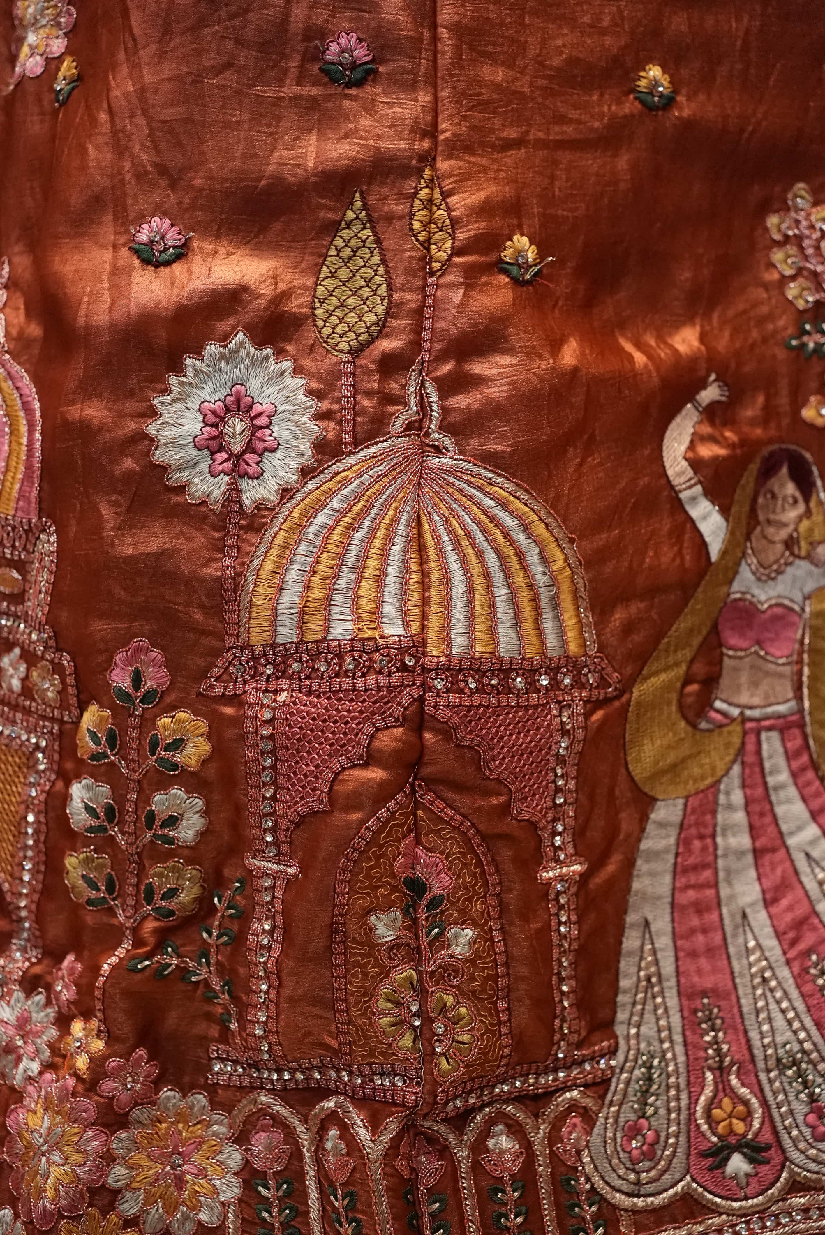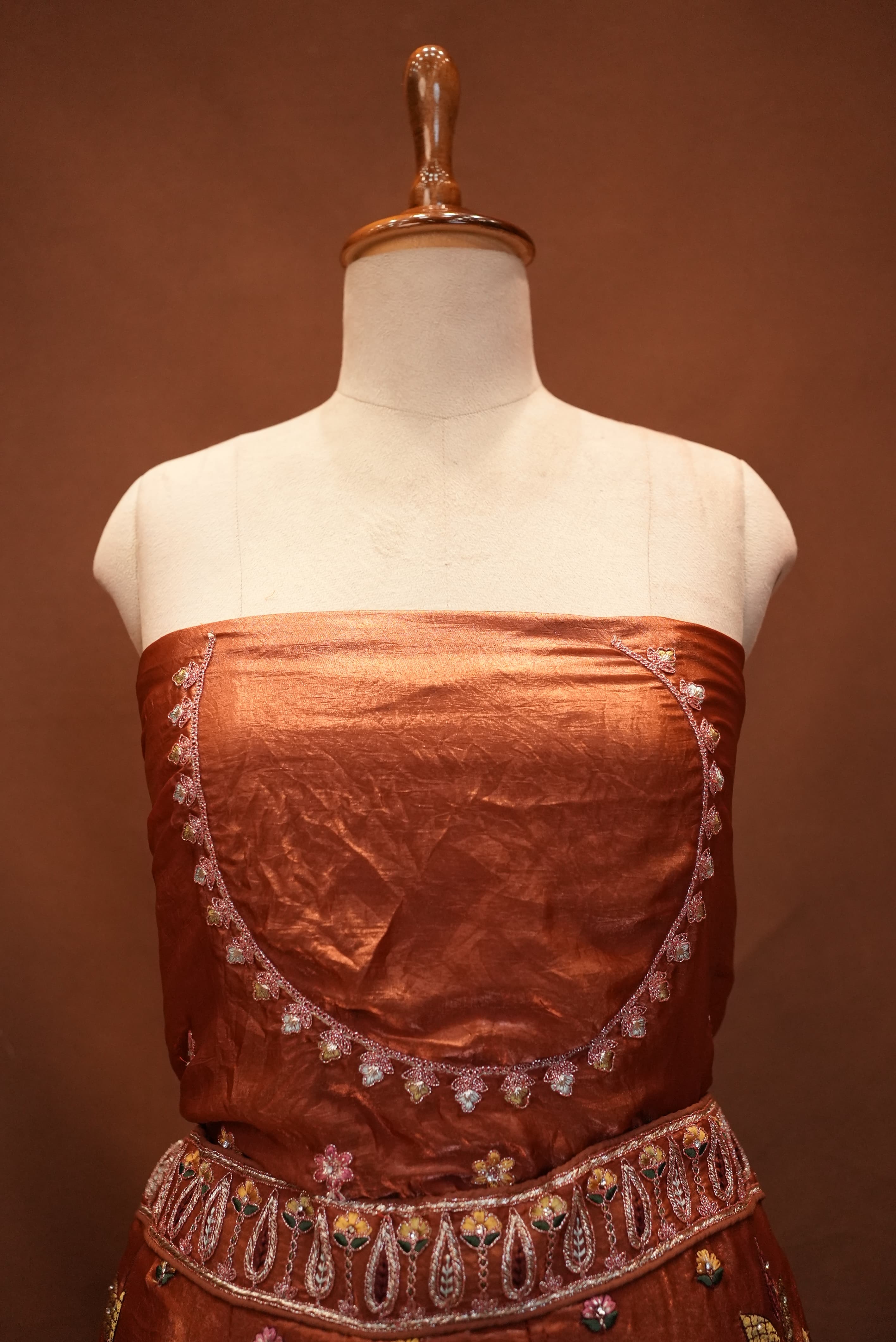 This luxurious Fendi fabric lehenga makes for a royal statement with beautiful intricate Darbari motifs and shimmering sequin work. The rich texture of the fabric enhances its royal appeal, while the detailed craftsmanship adds festive elegance. Paired with a heavy embellished dupatta, this lehenga is an ideal choice for weddings, receptions, and grand celebrations.