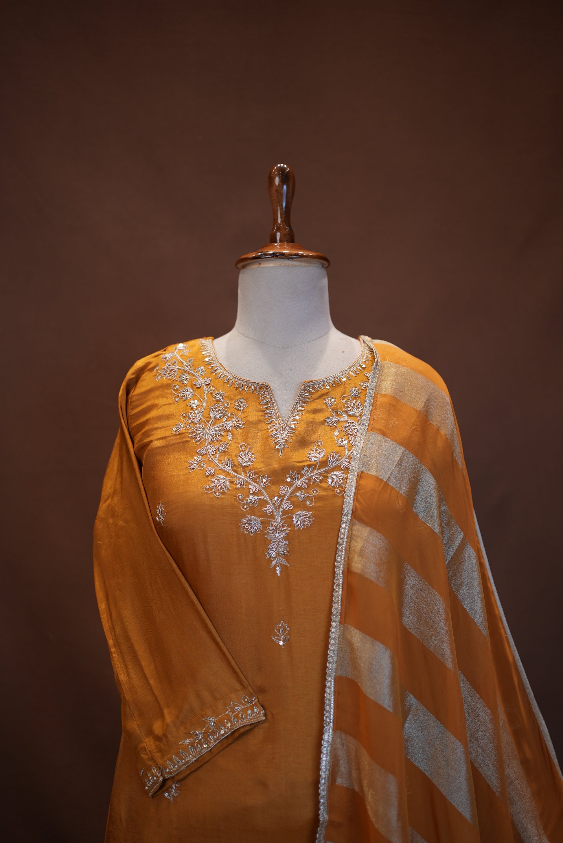 Pure Silk Suit, 3 piece, made of pure silk with an elegant addtion of Zardosi and sequence work, further embellished with a perfect dupatta of Banarasi origin with classic weaving patterns. Such an elegant piece of attire not only retains traditional craftsmanship with class, but is also apt to be worn on special events and celebrations, including marriage functions.