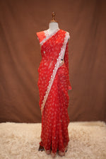 Celebrate the charm of traditional craftsmanship with this Rajasthani Bandhani Saree, beautifully adorned with Gota Patti work. Crafted in authentic Bandhani technique, the saree reflects vibrant Rajasthani heritage and timeless elegance. The delicate Gota Patti detailing adds a rich festive touch, making it perfect for special occasions.