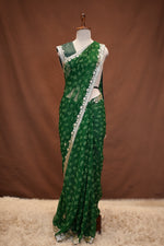 Celebrate the charm of traditional craftsmanship with this Rajasthani Bandhani Saree, beautifully adorned with Gota Patti work. Crafted in authentic Bandhani technique, the saree reflects vibrant Rajasthani heritage and timeless elegance. The delicate Gota Patti detailing adds a rich festive touch, making it perfect for special occasions.