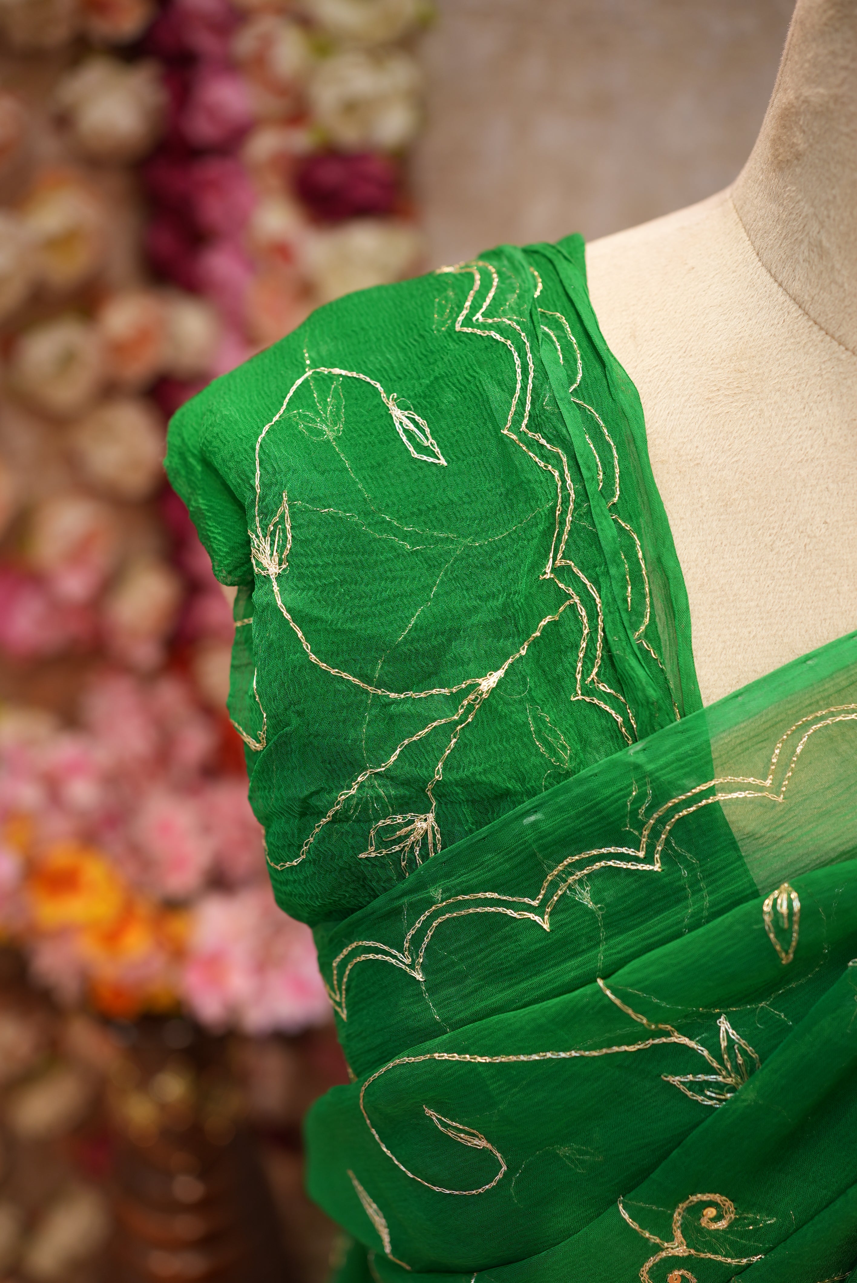 Experience the charm of royal Rajasthan with this Rajasthani Special Thakurji Chiffon Saree, beautifully adorned with traditional Aari Tari work. The delicate jaal pattern flows gracefully across the saree, while the intricate peacock design adds a touch of divine elegance and cultural richness. Crafted from lightweight chiffon fabric, this saree drapes effortlessly, offering comfort and sophistication in every fold.