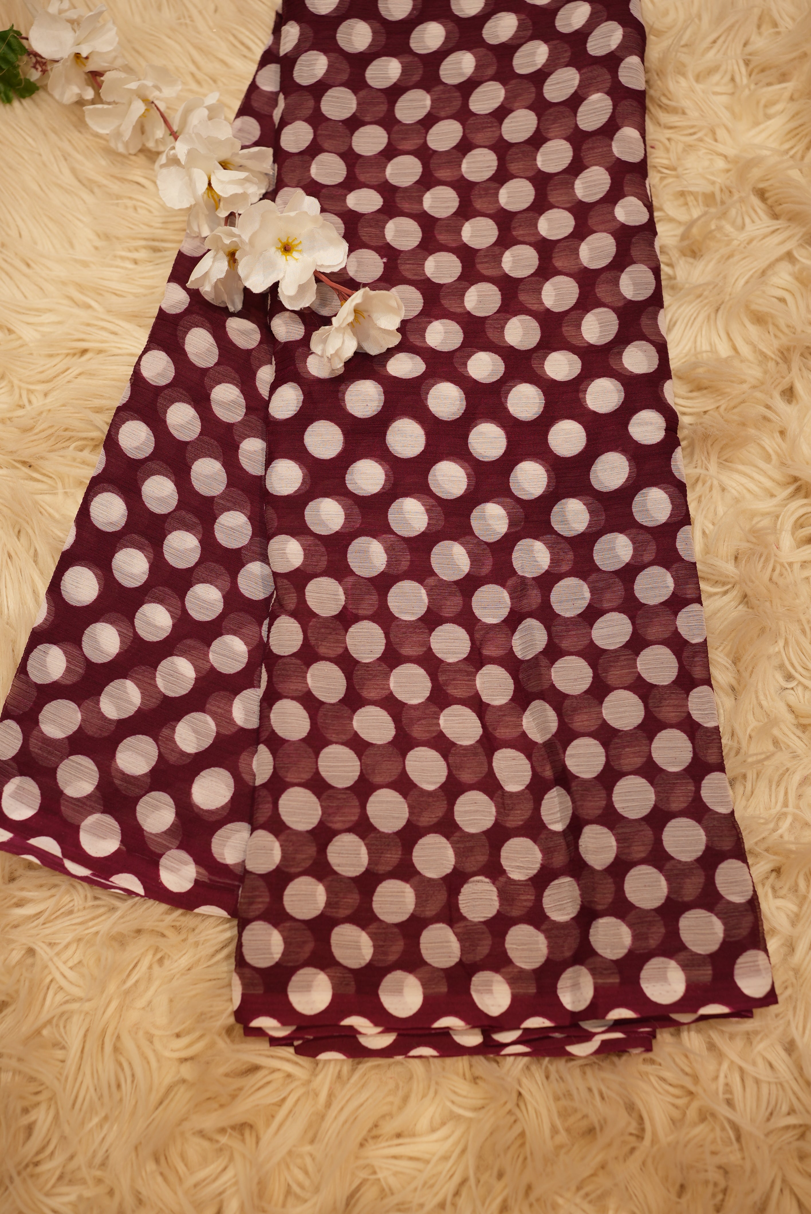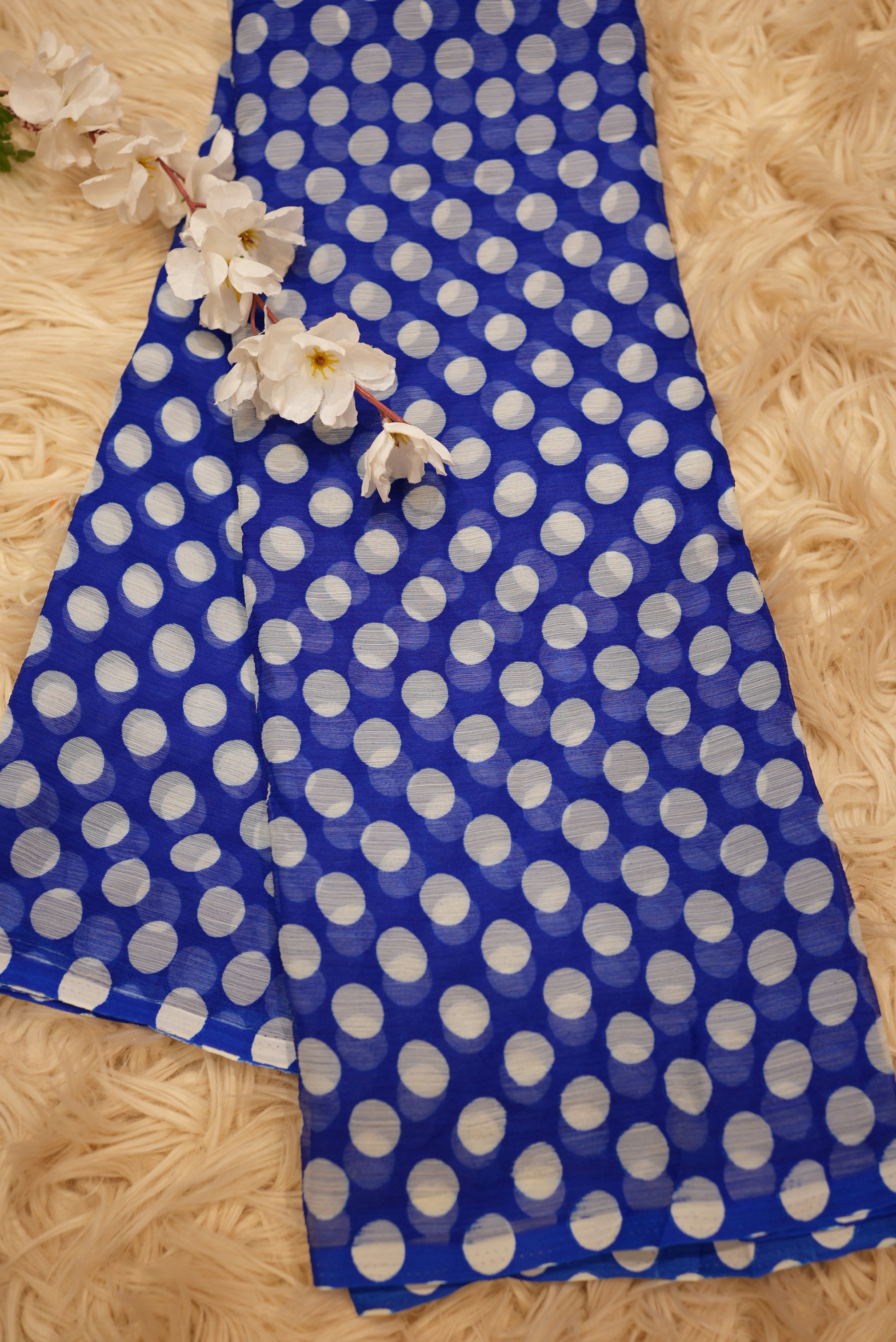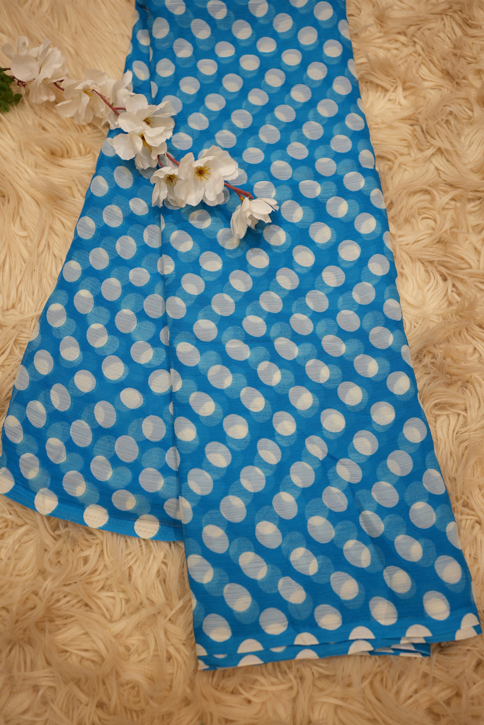 Step into timeless elegance with this retro-style polka dot saree, crafted from luxurious royal chiffon fabric. The soft, flowing texture drapes beautifully, creating a graceful silhouette that embodies vintage charm and sophistication. The classic polka dot pattern adds a playful yet refined touch, making it perfect for both casual gatherings and special occasions. Designed without a blouse, this saree allows you to pair it with your favorite contrasting or matching blouse to express your unique style