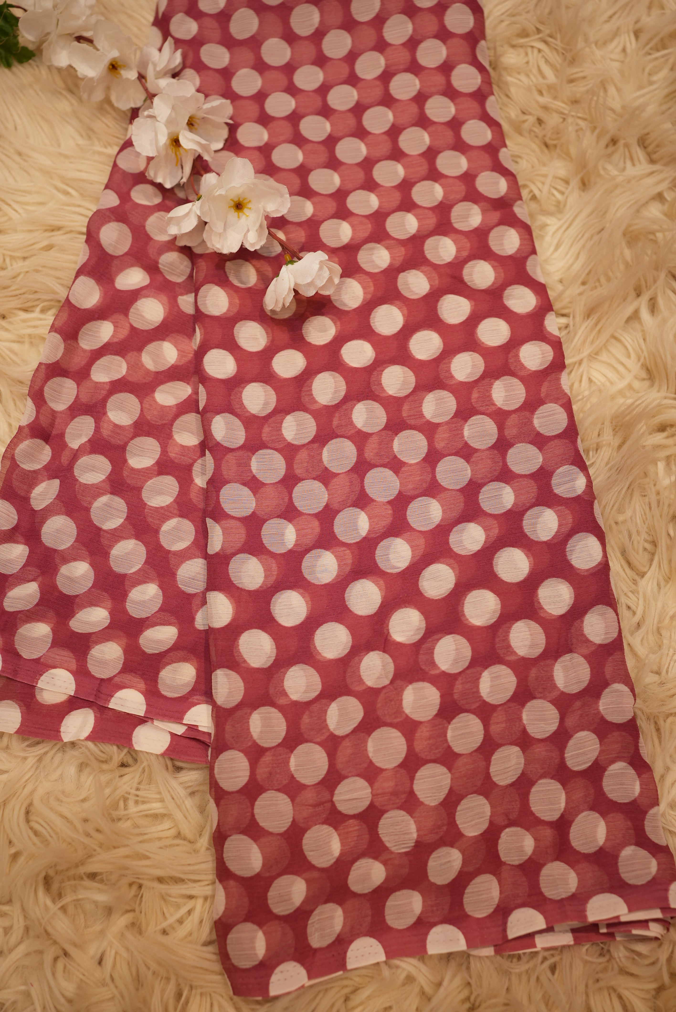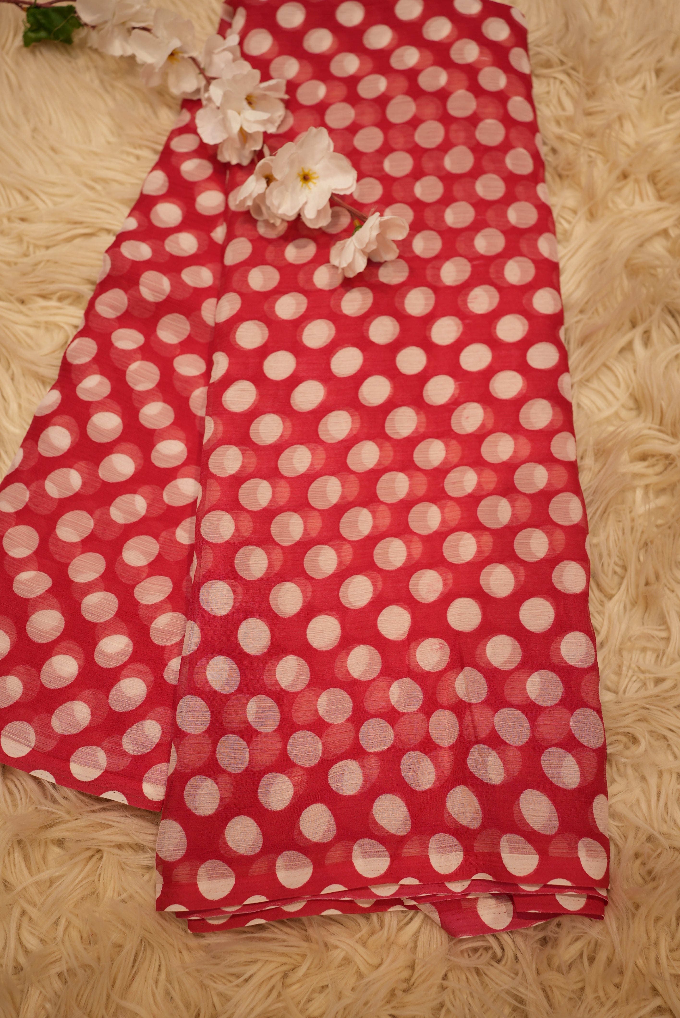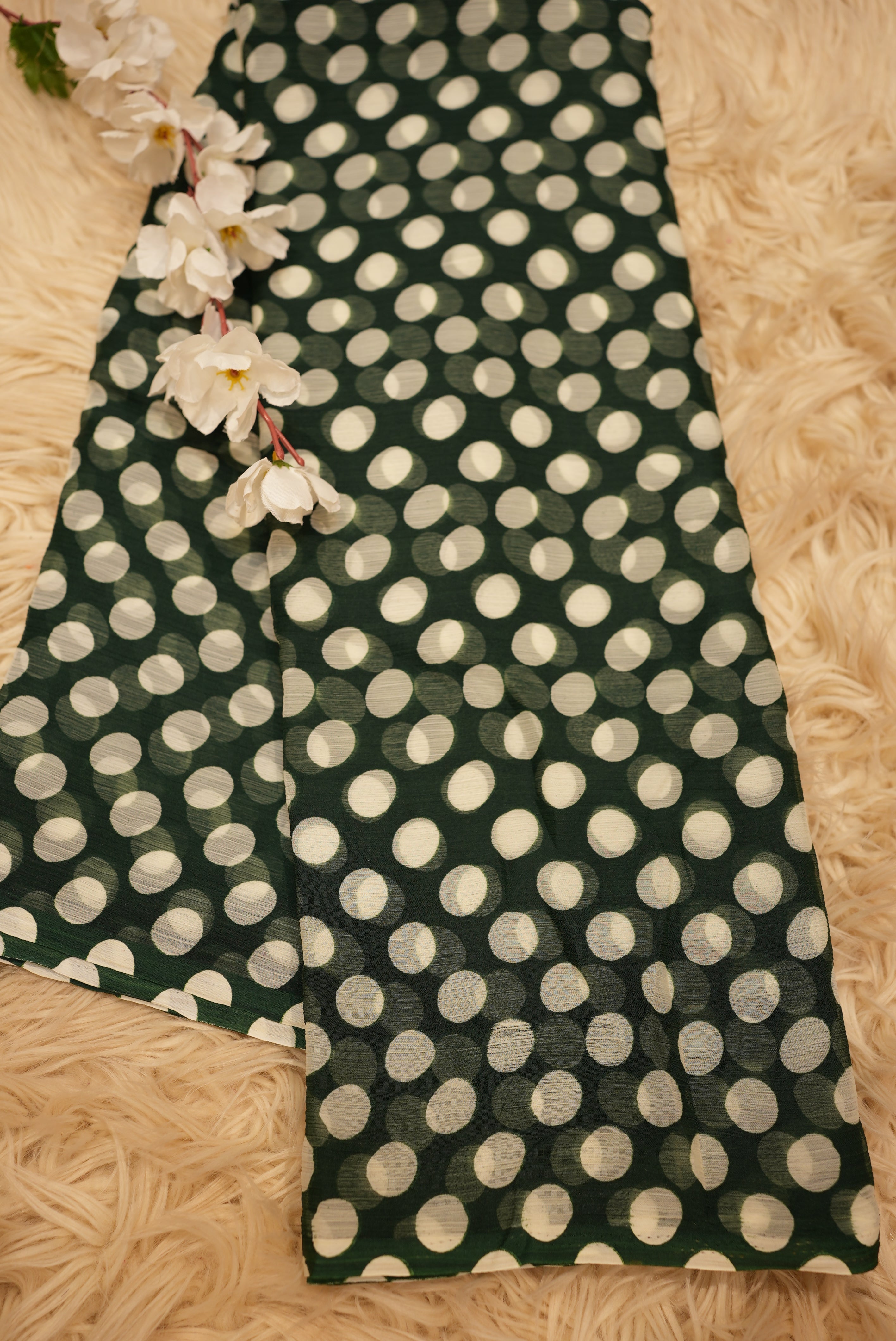 Step into timeless elegance with this retro-style polka dot saree, crafted from luxurious royal chiffon fabric. The soft, flowing texture drapes beautifully, creating a graceful silhouette that embodies vintage charm and sophistication. The classic polka dot pattern adds a playful yet refined touch, making it perfect for both casual gatherings and special occasions. Designed without a blouse, this saree allows you to pair it with your favorite contrasting or matching blouse to express your unique style