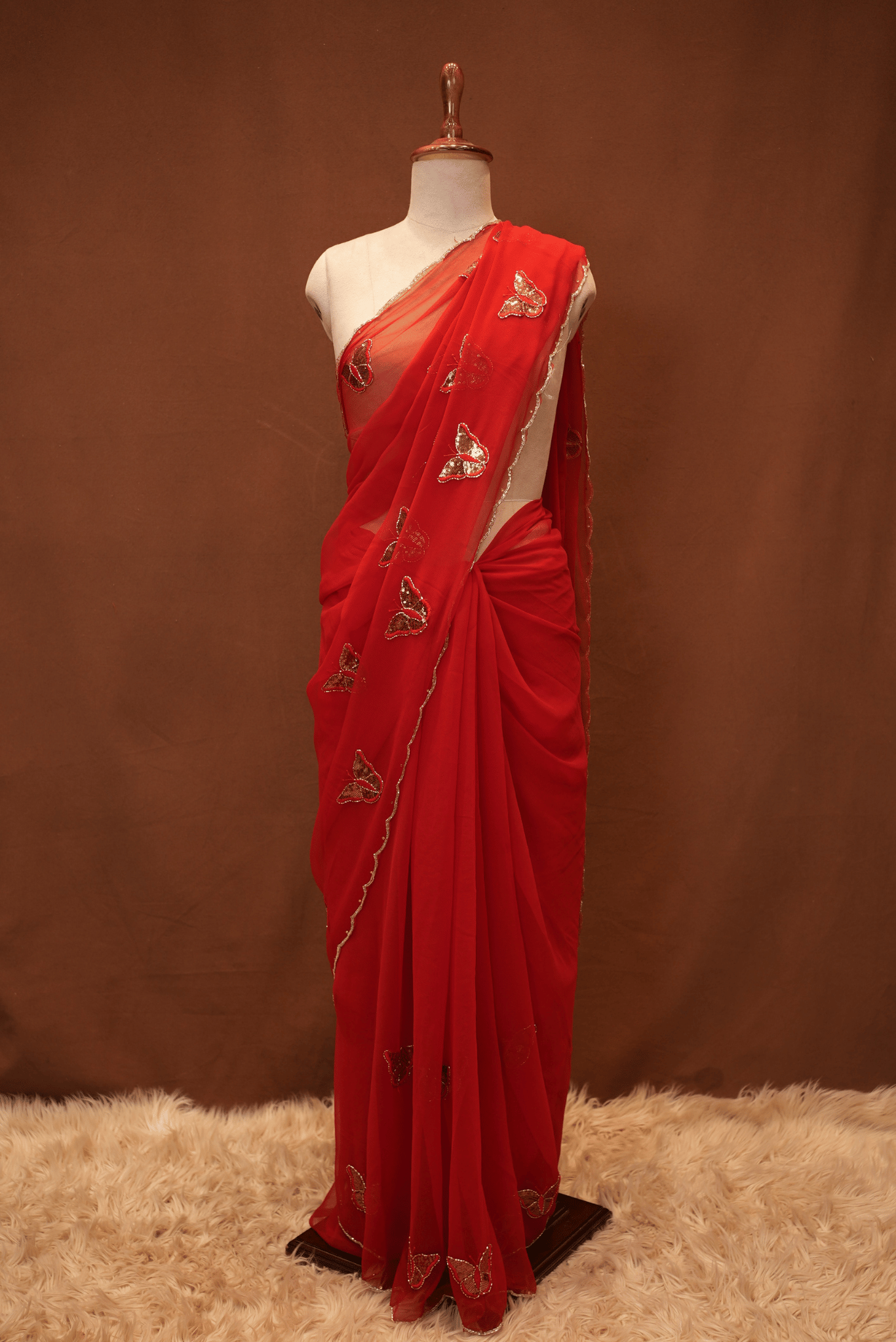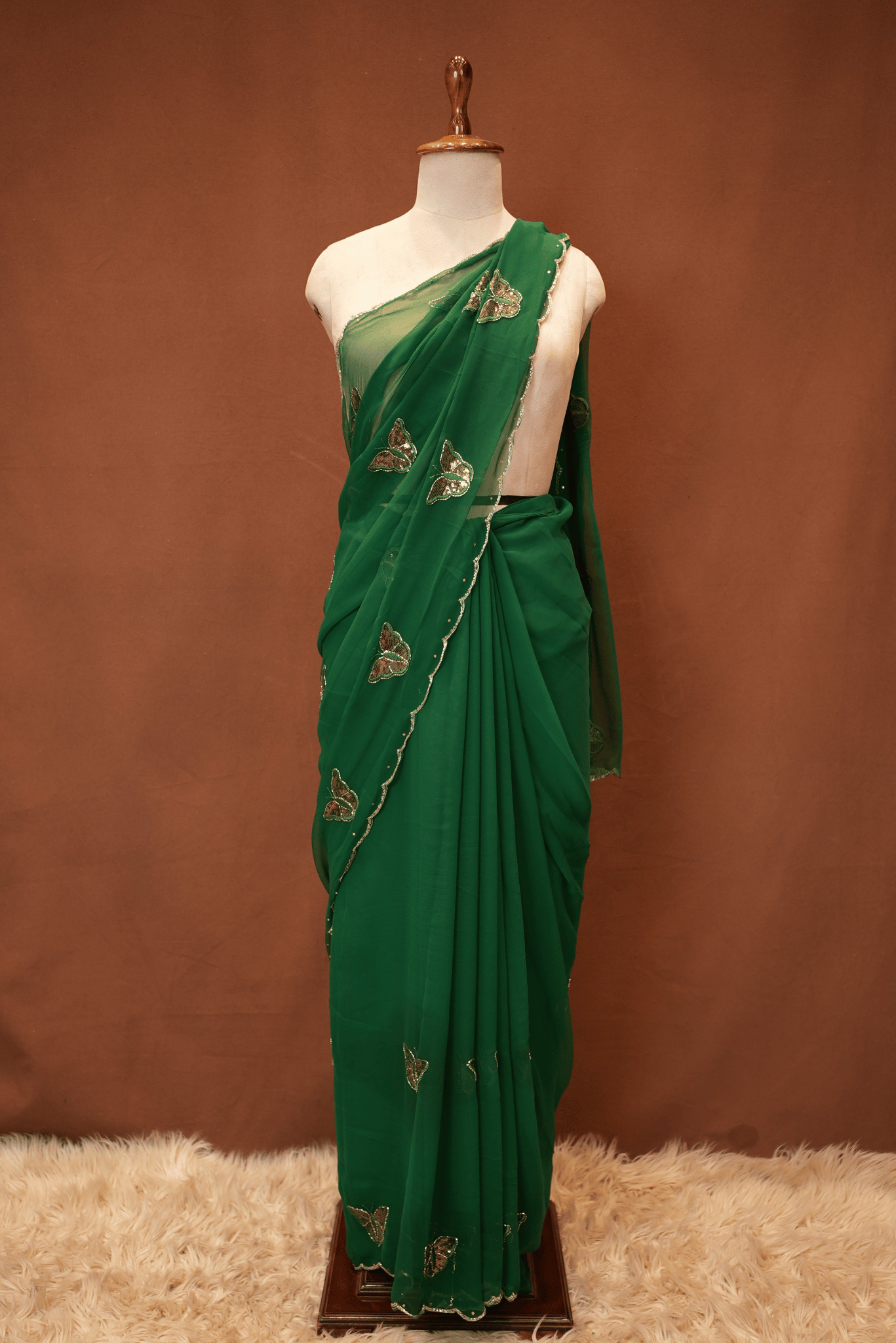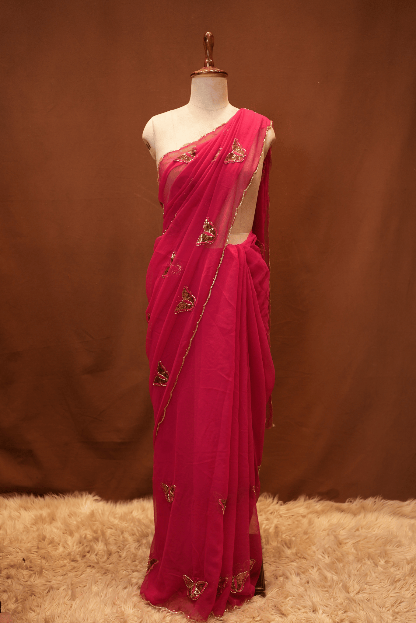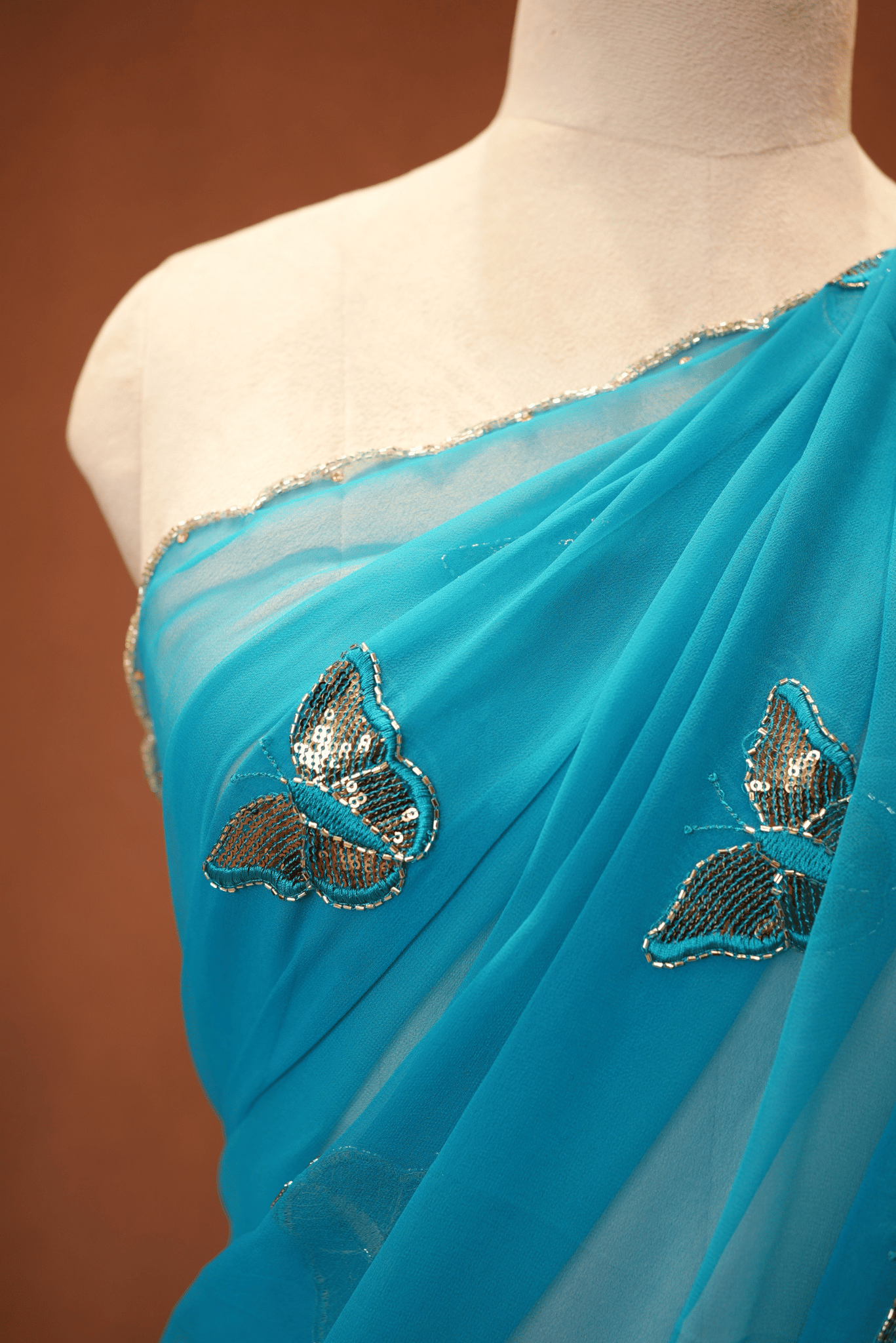 Graceful and elegant, this Georgette fabric saree features a delicate butterfly design that adds a touch of charm and femininity. The saree is beautifully enhanced with an intricate cutwork border, giving it a refined and stylish finish. Lightweight and flowy, it drapes effortlessly, making it perfect for festive occasions, parties, and special events. Paired with a matching blouse, this saree blends modern design with timeless elegance, ensuring a stunning and sophisticated look.