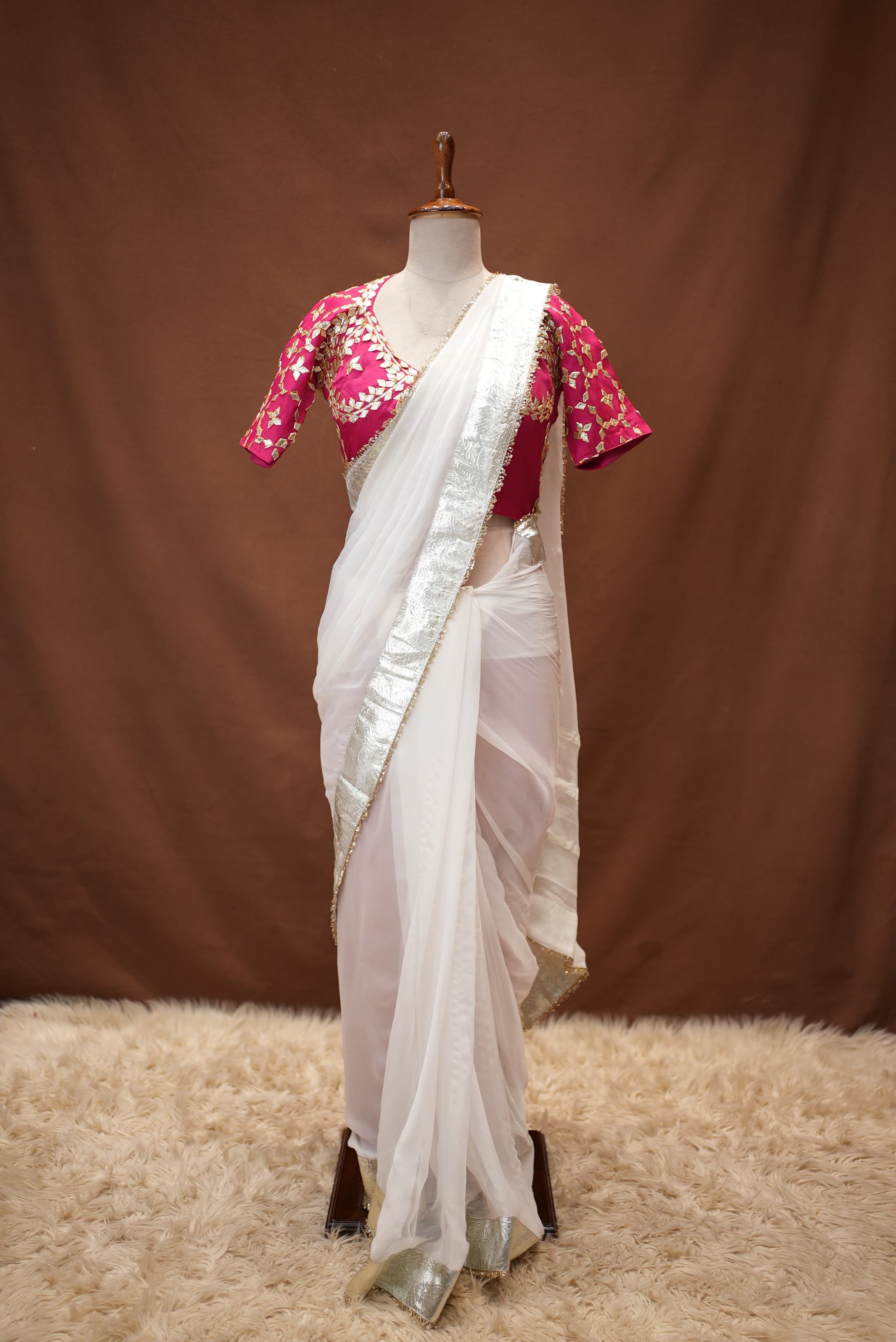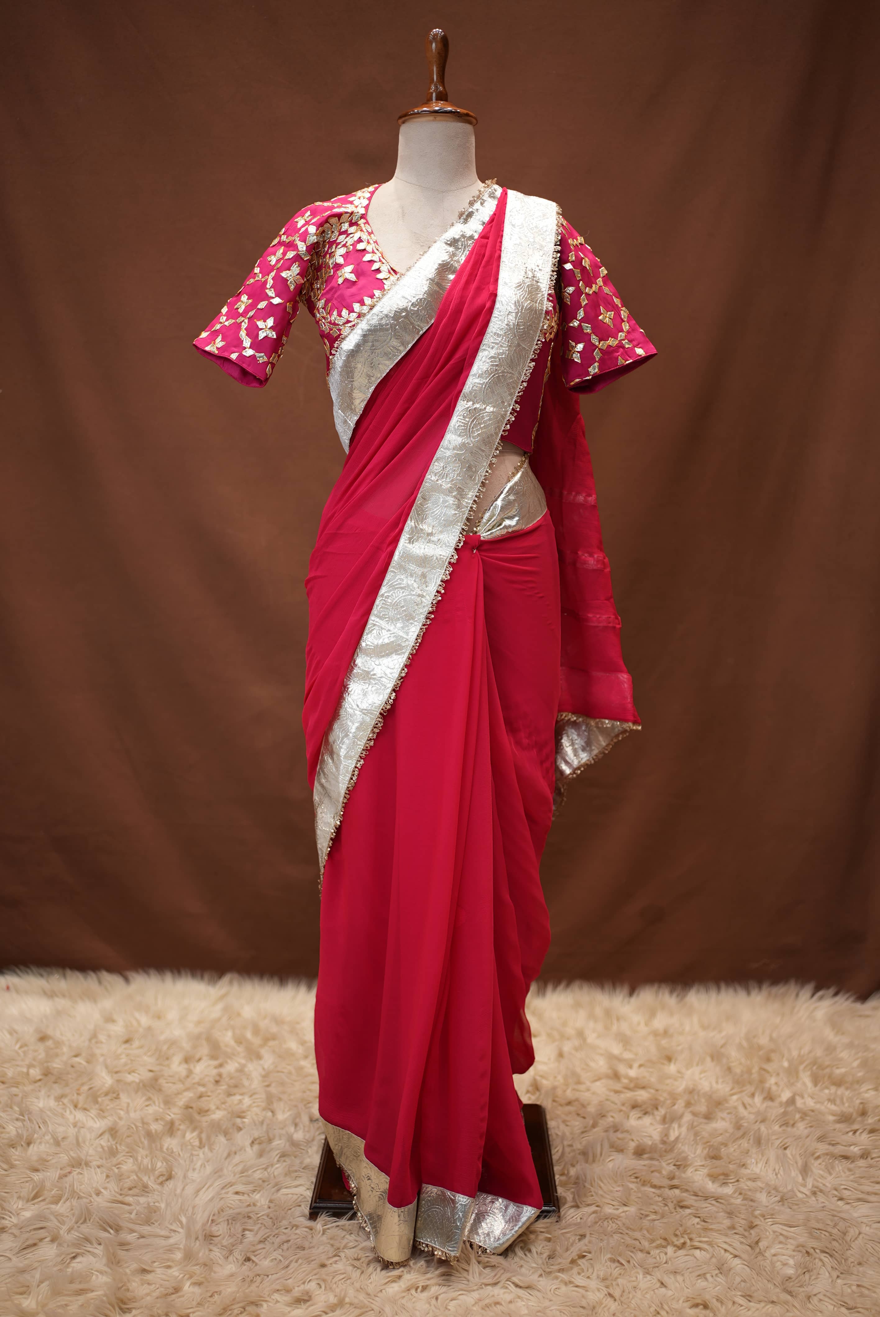 Traditional Rajasthan's beauty meets modern elegance in this chiffon fabric saree, accompanied by a beautifully handcrafted Rajasthani Angi Blouse. The fine gota patti work on the blouse gives the outfit a royal and graceful look. The lightweight chiffon fabric makes the saree feel effortless and flowy. This quality makes it a perfect choice for festive occasions, cultural functions, and special gatherings.