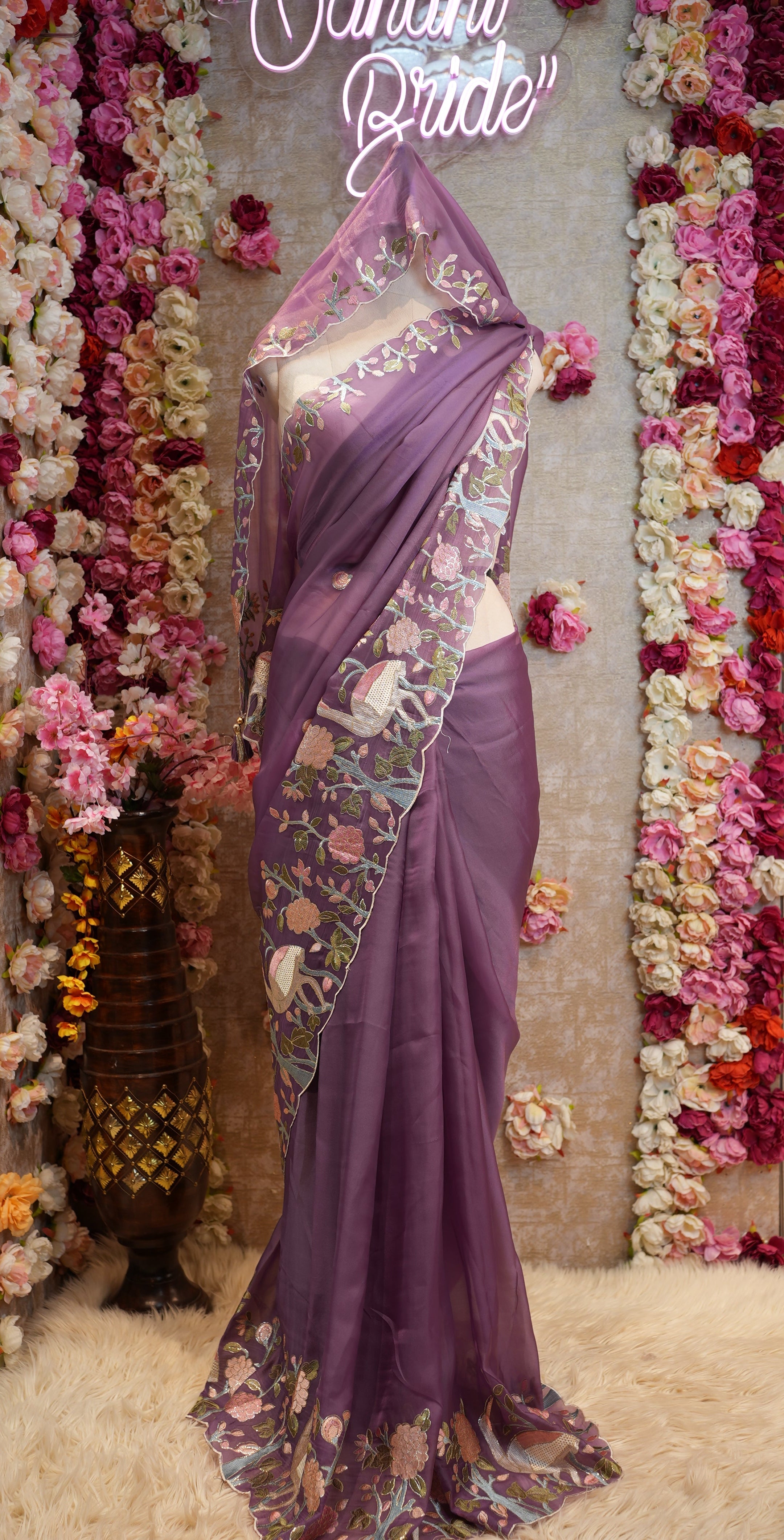 Step into elegance with this mesmerizing Thread Work Saree, beautifully adorned with a unique figure pattern and exquisite panel work featuring the Sawan design. The saree showcases a heavy border, enhancing its rich and graceful appeal. Crafted with meticulous thread embroidery, it offers a perfect balance of tradition and sophistication. Paired with a mono-tone thread work blouse, this ensemble is ideal for festive occasions, weddings, and grand celebrations.