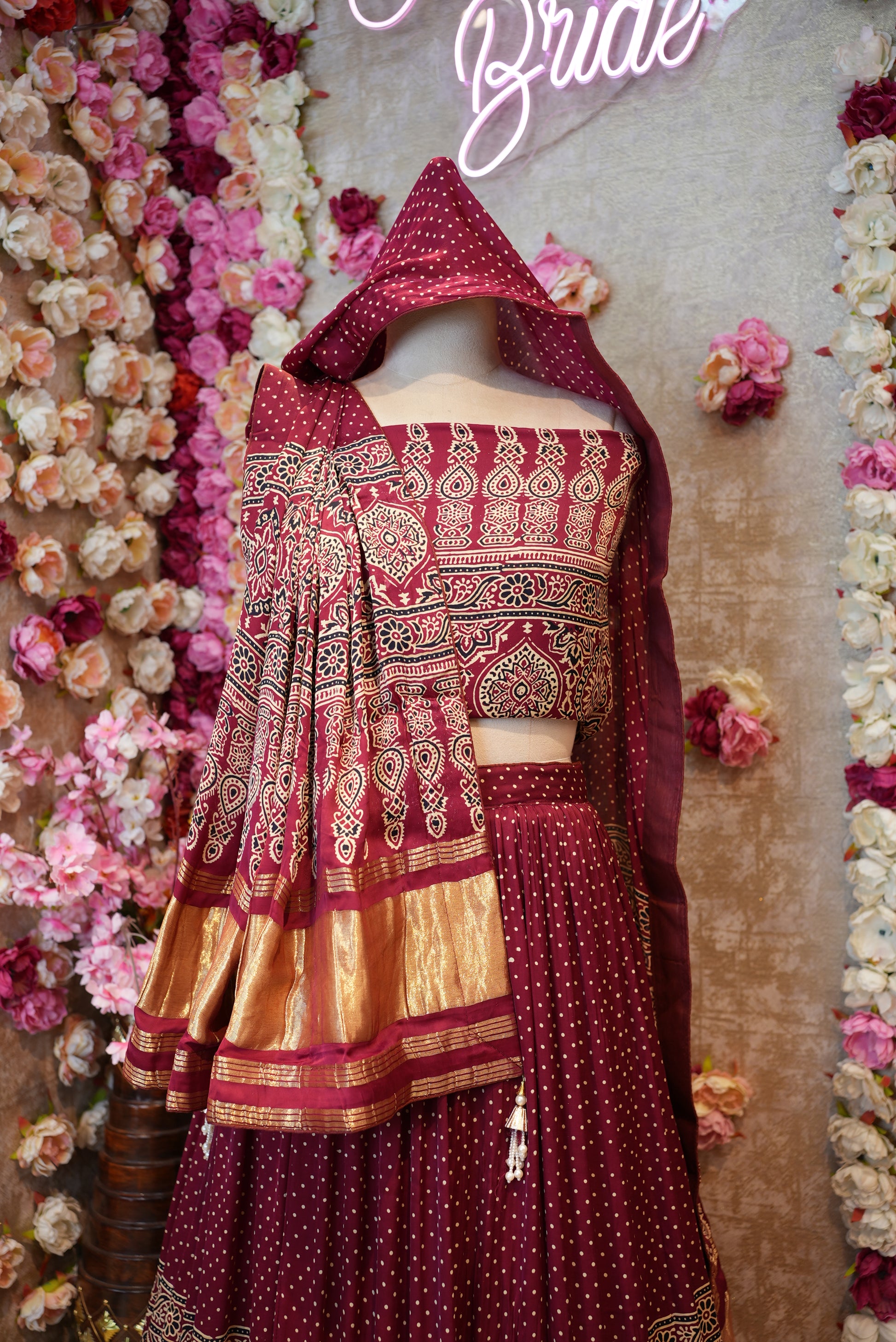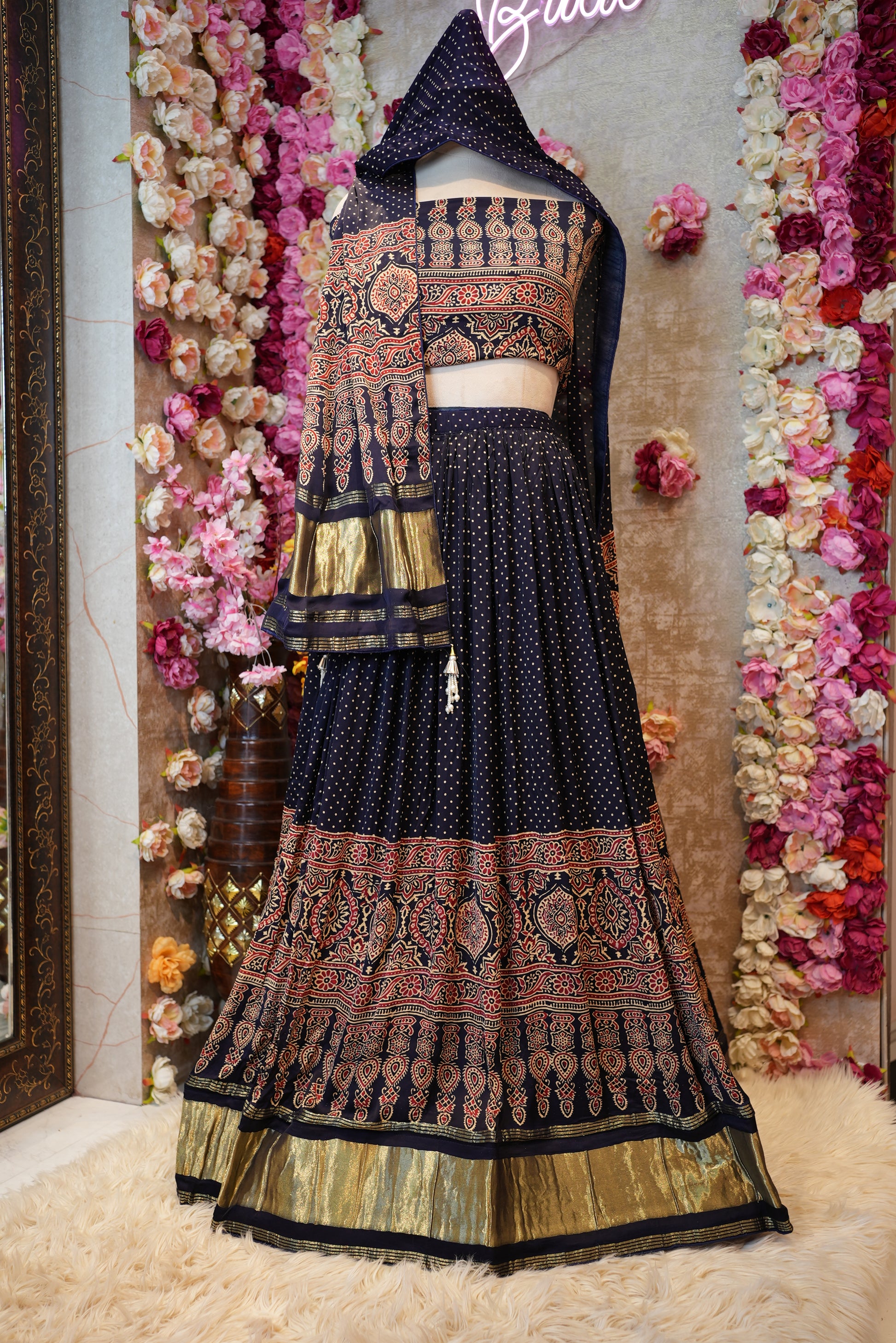 Crafted from luxurious modal gajji silk, this lehenga showcases the timeless beauty of Ajrak print, blending heritage artistry with modern elegance. The ensemble features a flowy lehenga, complemented by a matching dupatta and a stylish blouse, making it perfect for festive occasions, weddings, or cultural celebrations. Its rich texture, vibrant patterns, and traditional appeal ensure you stand out with grace and sophistication.