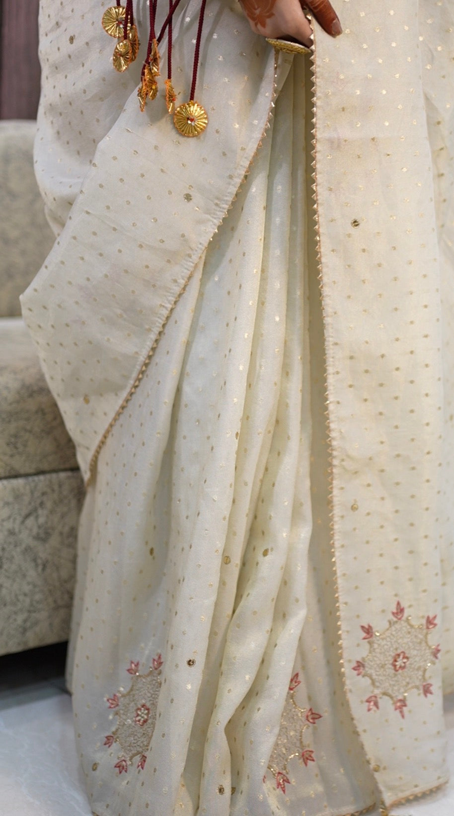 This luxurious saree is crafted in pure tissue fabric, featuring elegant zari weaving inspired by timeless vintage workmanship. The lightweight yet rich texture of the tissue fabric gives the saree a graceful fall and a refined, royal appeal.